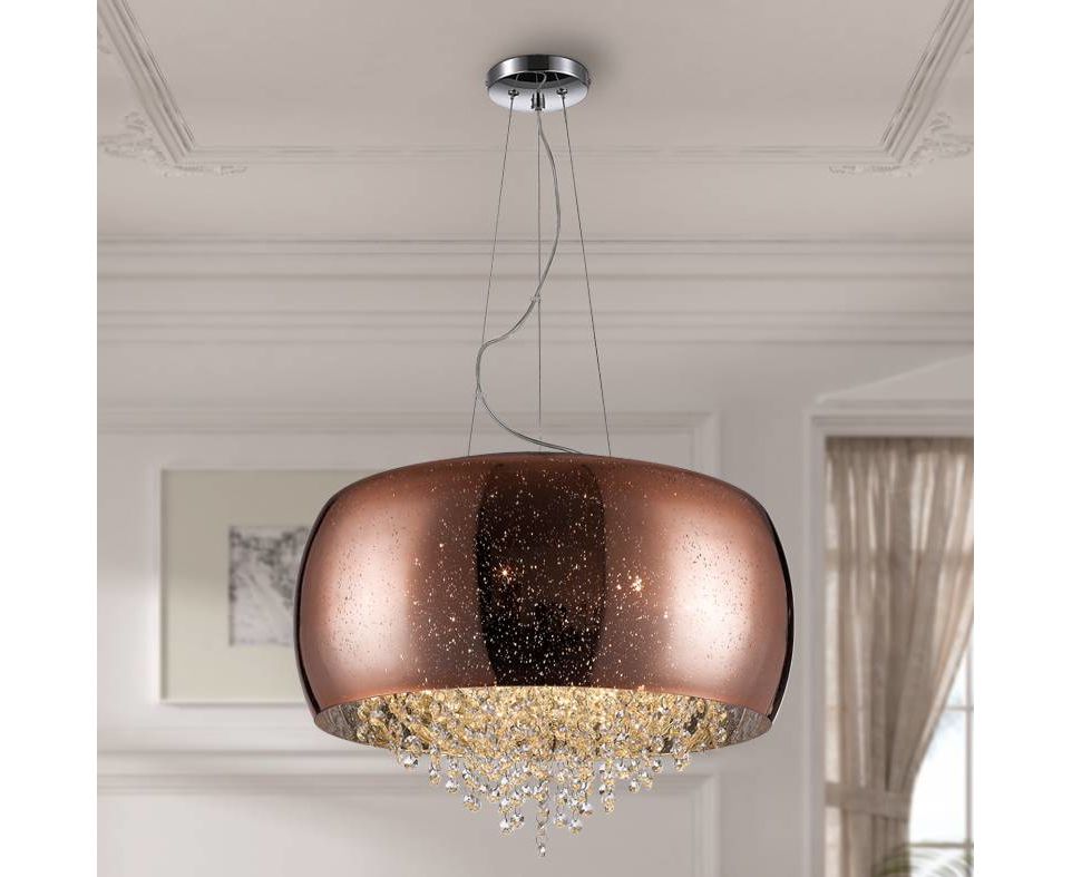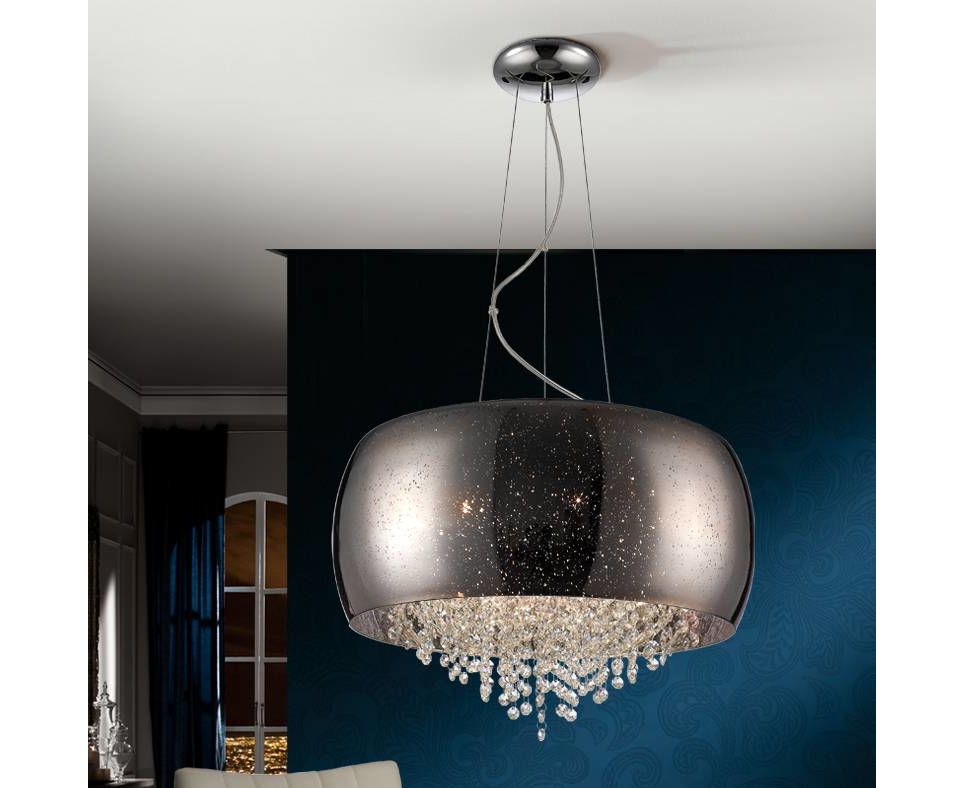 Подвесной светильник из металла с покрытием "хром". Плафон из зеркального дутого стекла серебристого цвета с декоративным рисунком "звёздная пыль", внутри подвески из гранёного стекла.