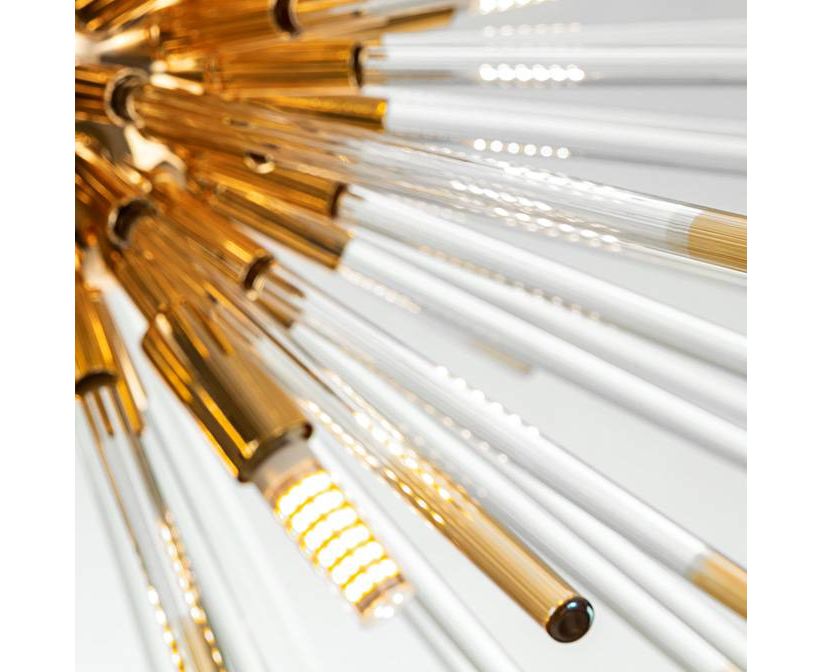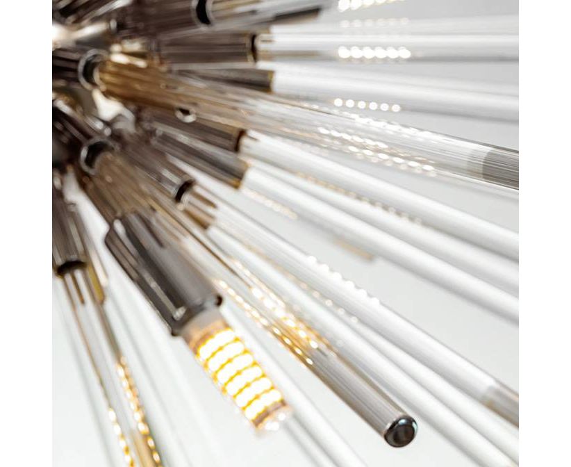 Подвесной шарообразный светильник из хромированного металла. Стержни из прозрачного стекла с покрытием "янтарь" на концах, с регулируемой высотой.