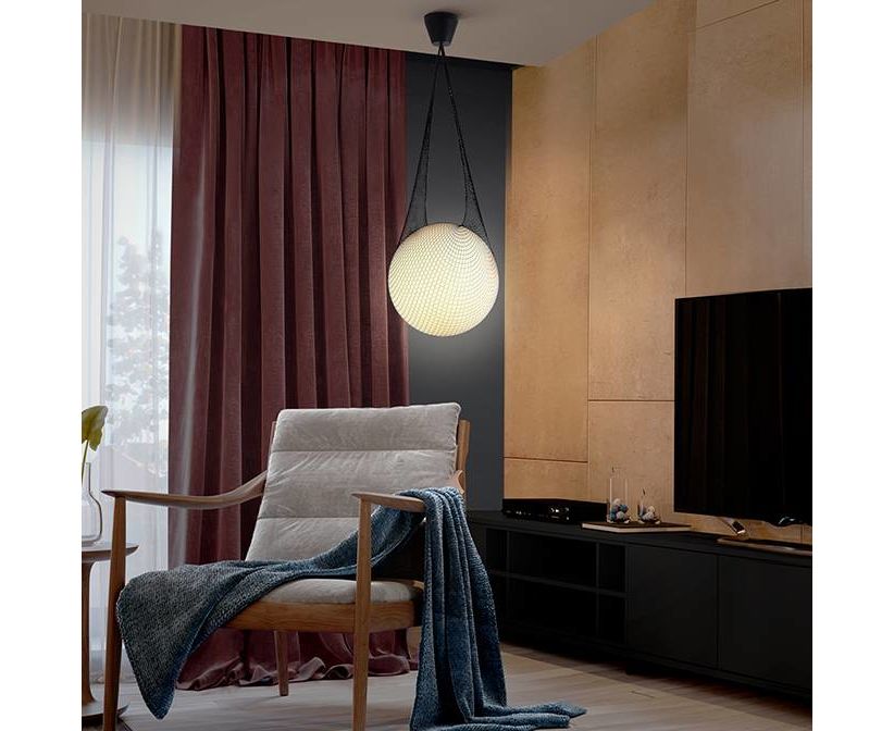 Подвесной светильник с сферическим плафоном из опалового стекла, сетка из текстиля чёрного цвета.