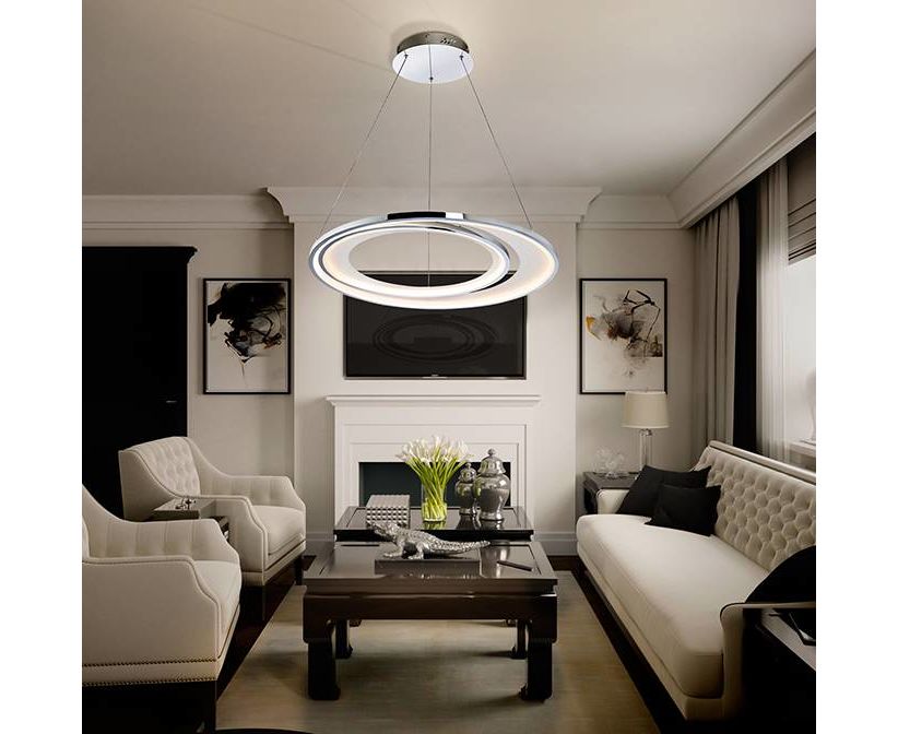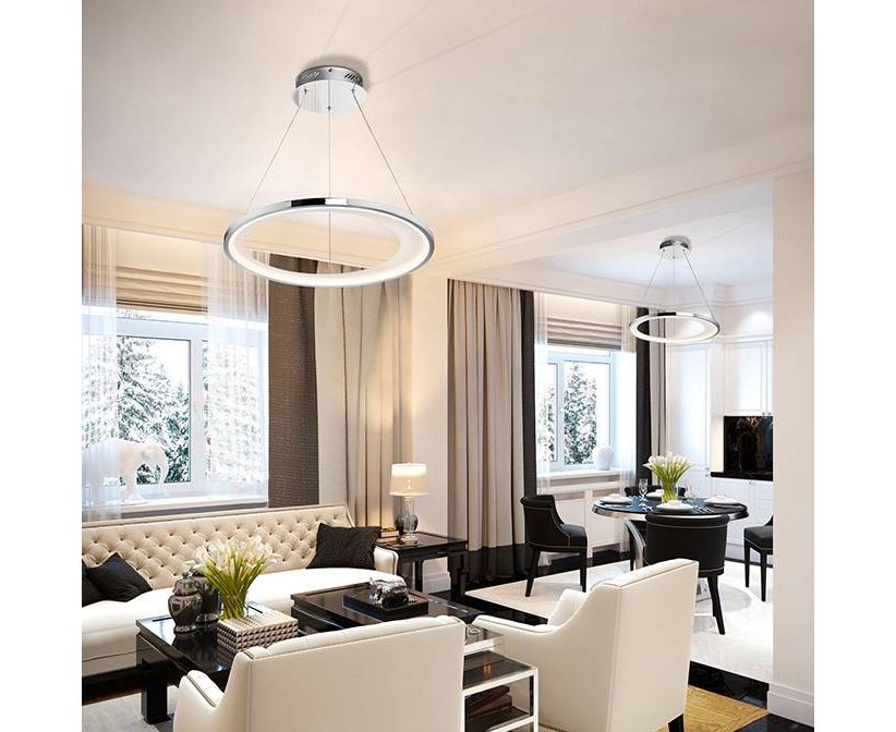 Подвесной светильник LED из металла с покрытием "хром" и матовым белым покрытием. Акриловый рассеиватель опaлового цвета, с регулируемой высотой.