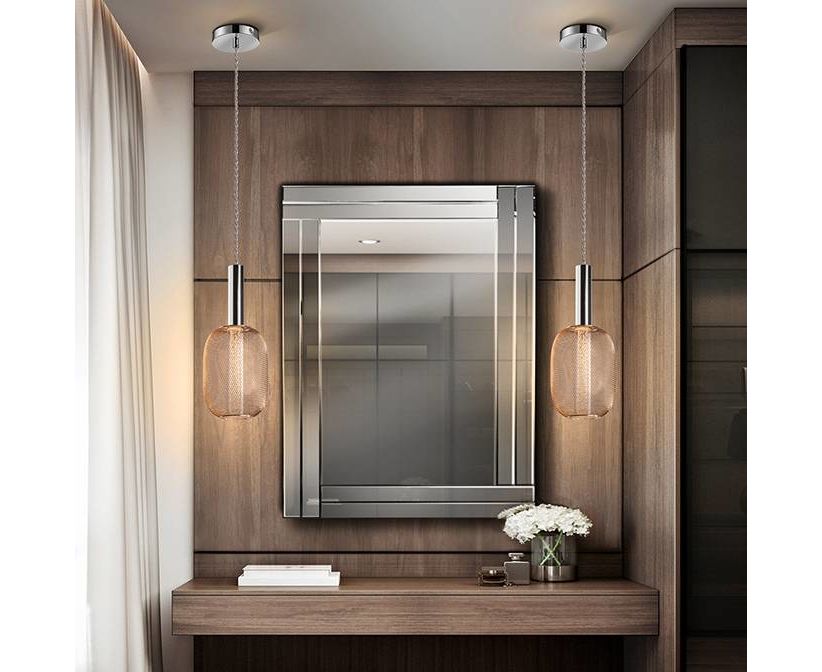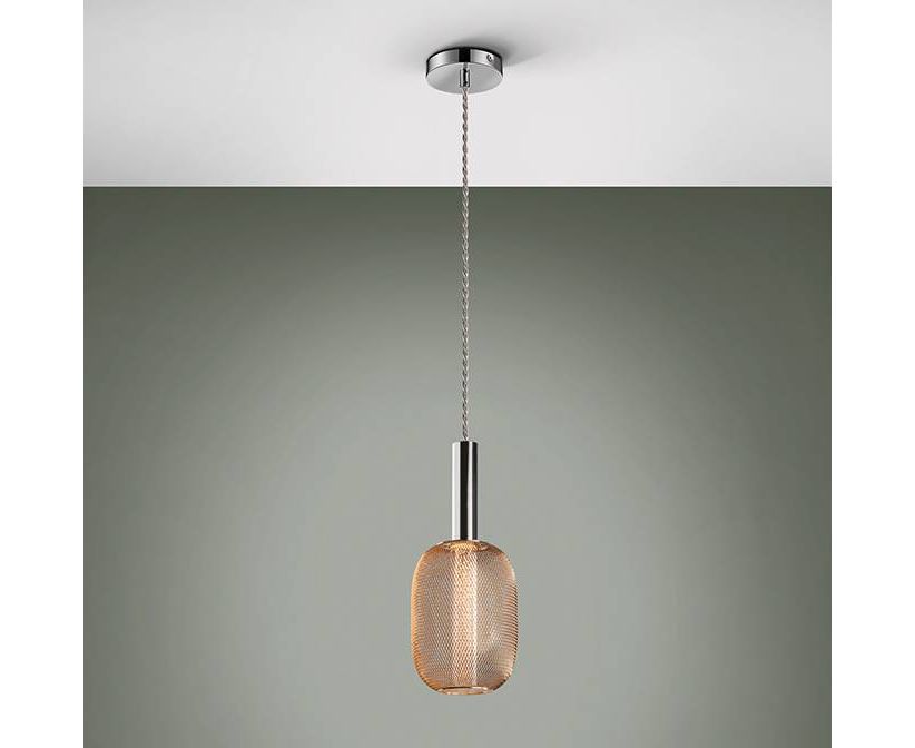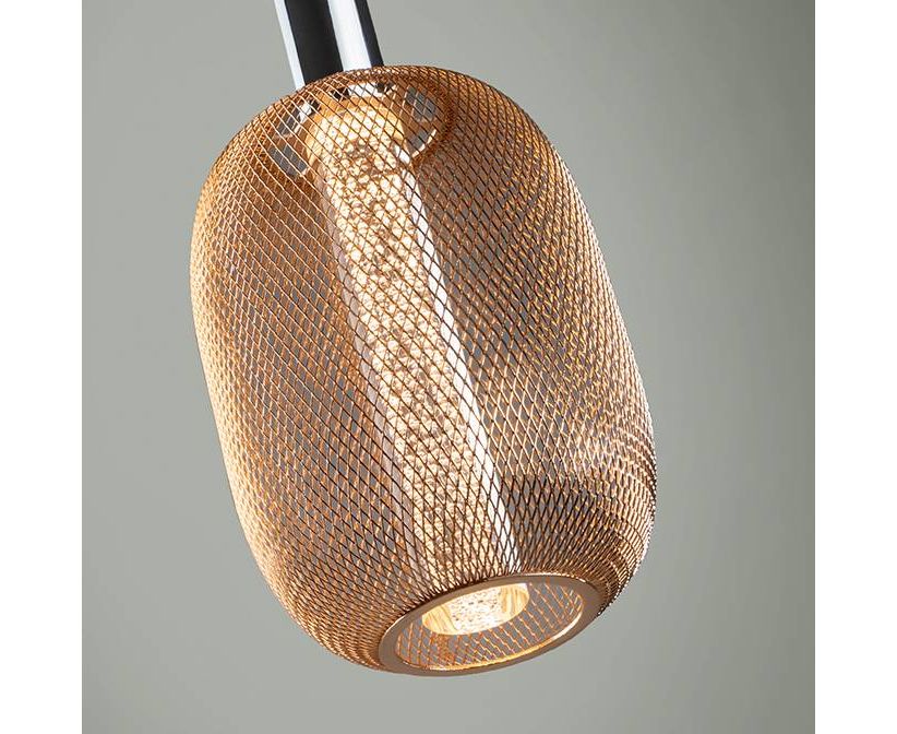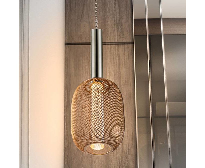 Подвесной светильник LED с 1 лампой из хромированного металла. Двойной плафон с внутренним цилиндром из прозрачного акрила с пузырьками и внешний из металлической сетки с покрытием "блестящее золото"