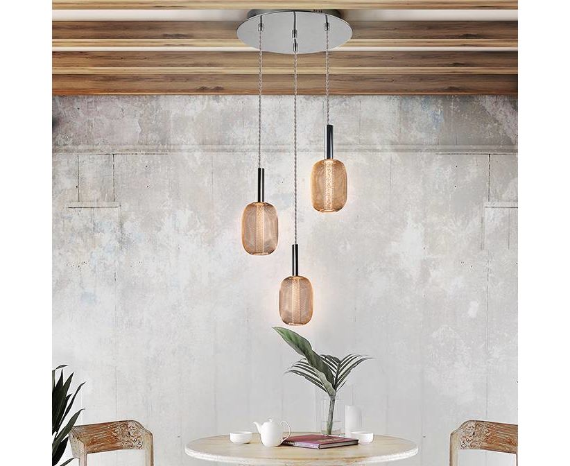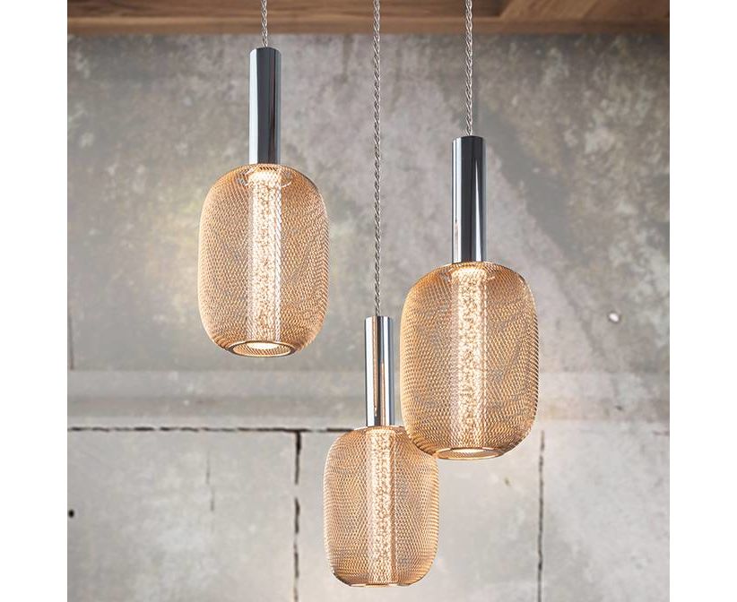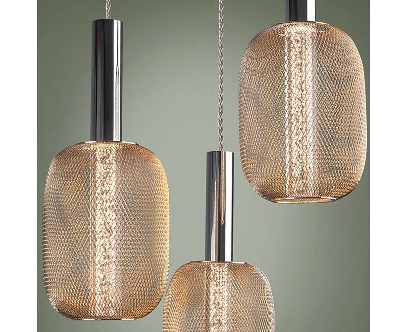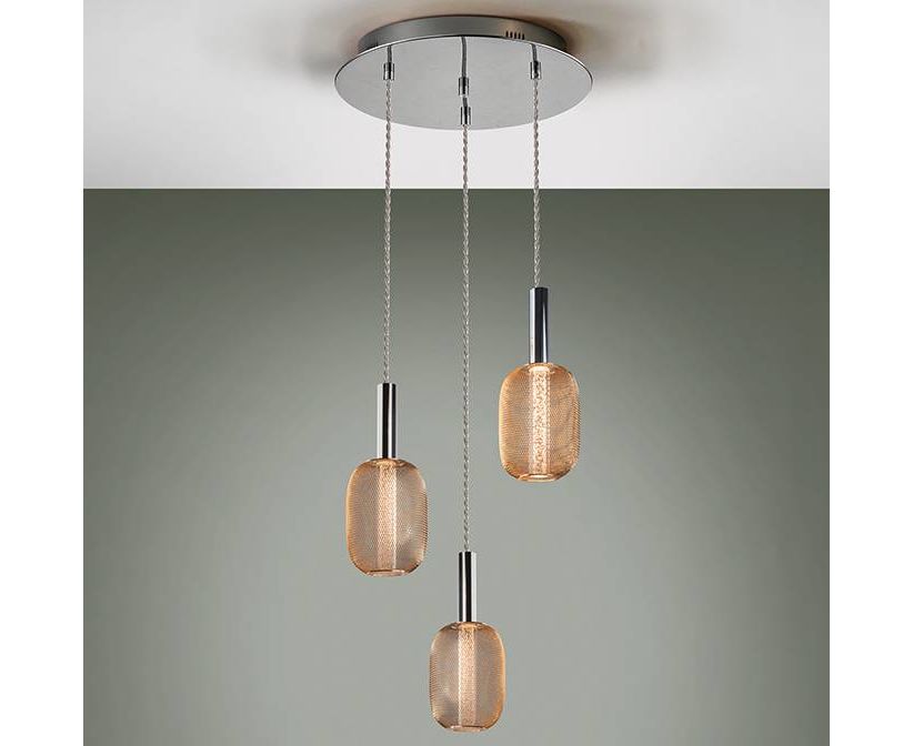 Подвесной светильник LED с 3 лампами из хромированного металла. Двойной плафон с внутренним цилиндром из прозрачного акрила с пузырьками и внешний из металлической сетки с покрытием "блестящее золото"
