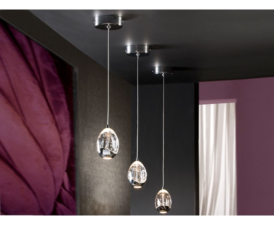 Подвесной светодиодный светильник из металла с покрытием "золото", плафоны в форме капли из массивного стекла с декоративными пузырьками внутри, с регулируемой высотой. 5W LED, 650 Lumen, 3.000K.
