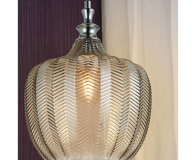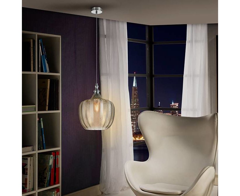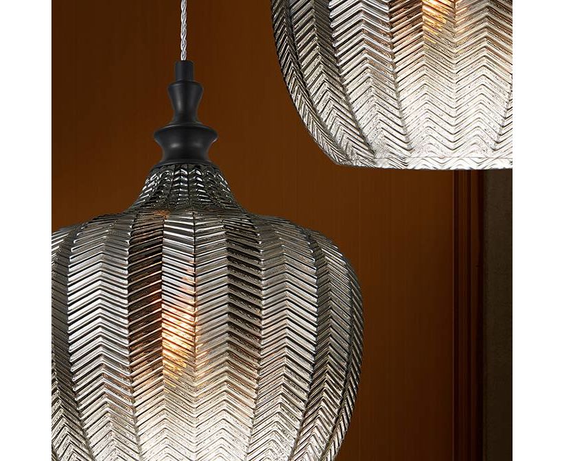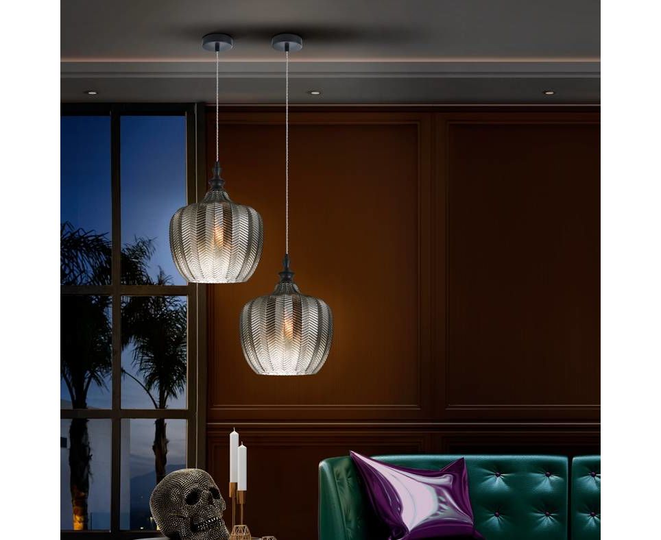 Подвесной светильник с 1 лампой, из металла с матовым чёрным покрытием. Плафон с рельефным узором "колосок" из стекла дымчато-зеркального цвета с градиентным переходом в прозрачный тон. С регулируемой высотой.