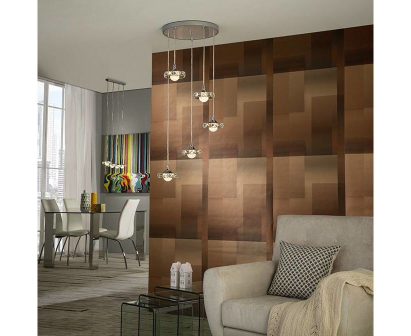 Подвесной светодиодный светильник с 5 лампами из металла с покрытием "хром". Круглые внешние плафоны из гранёного прозрачного стекла, с хромированным кольцом, шаровидный рассеиватель с зернистой поверхностью