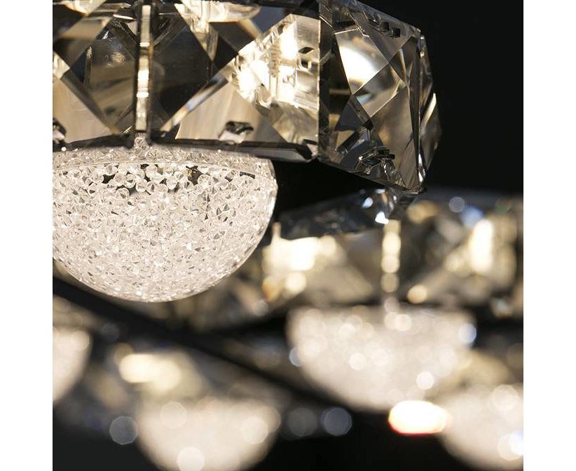 Подвесной светодиодный светильник с 8 лампами из металла с покрытием "хром". Круглые внешние плафоны из гранёного прозрачного стекла, с хромированным кольцом, шаровидный рассеиватель с зернистой поверхностью