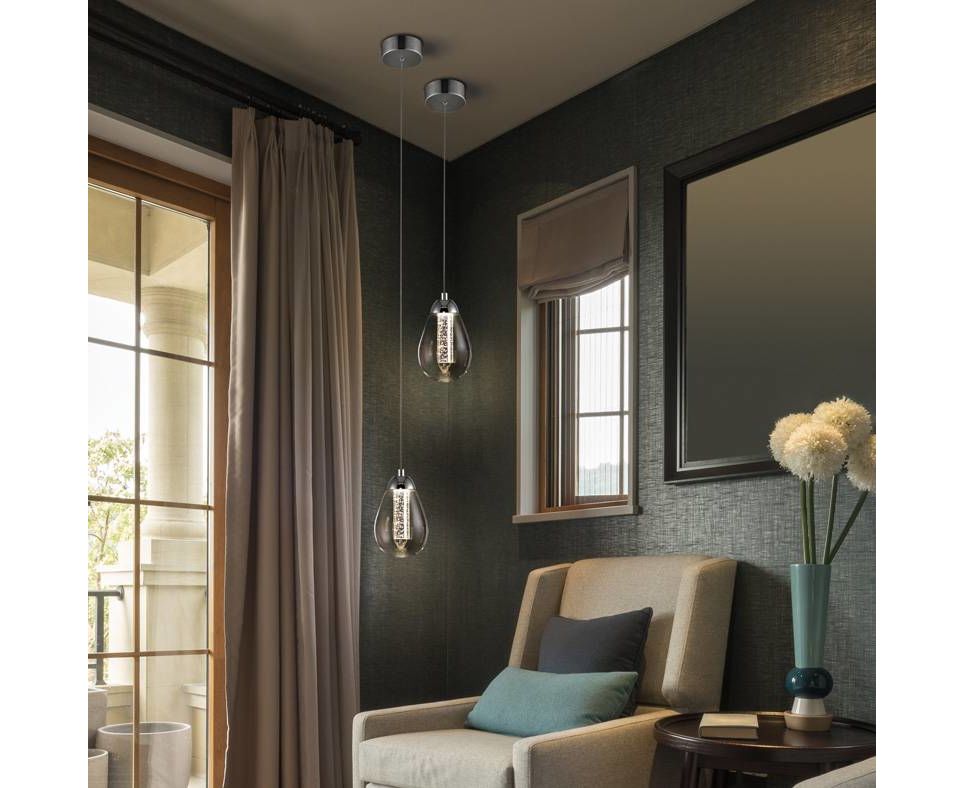 Подвесной светильник с 1 лампой LED, из металла с покрытием "хром". Двойной абажур: внешний - грушевидной формы из прозрачного стекла, внутренний - брусок из метакрилата с декоративными пузырьками, с регулируемой высотой.