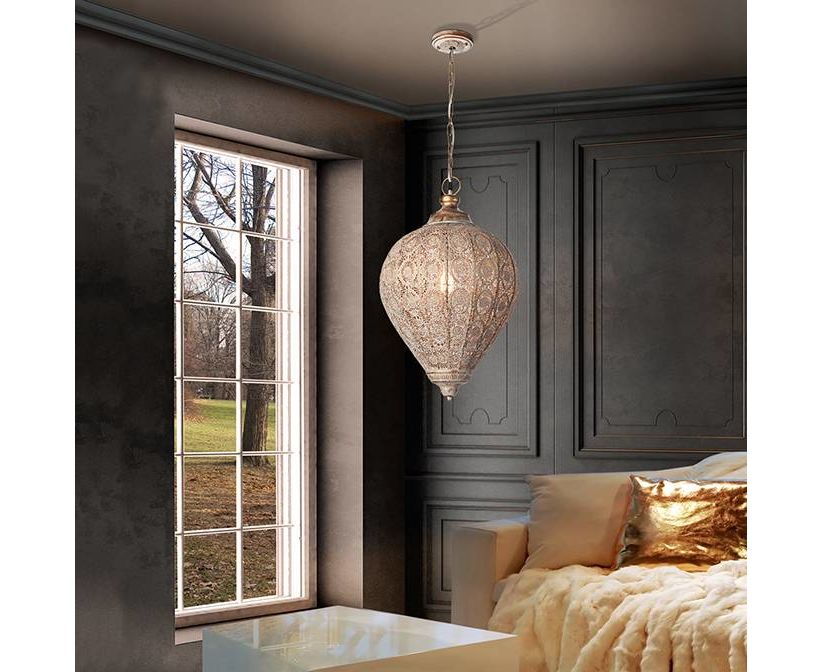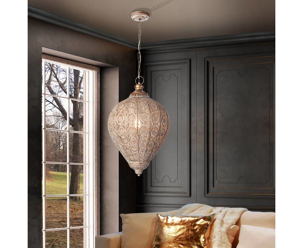 Подвесной светильник с 1 лампой из металла со штампованной резьбой, покрытие цвета "шампань" с золотистыми элементами и с белой патиной.