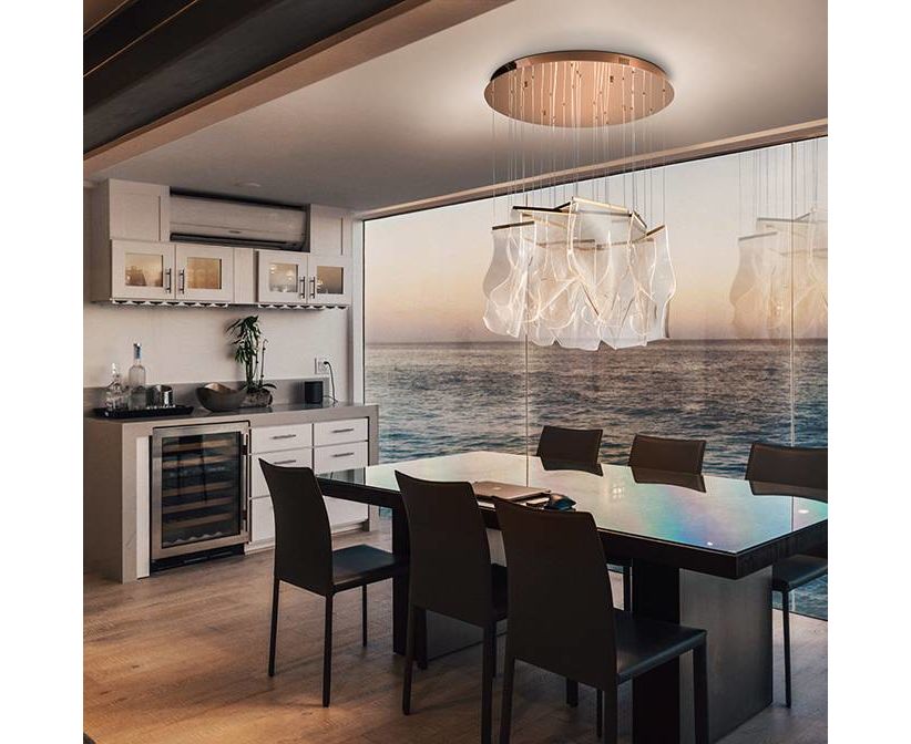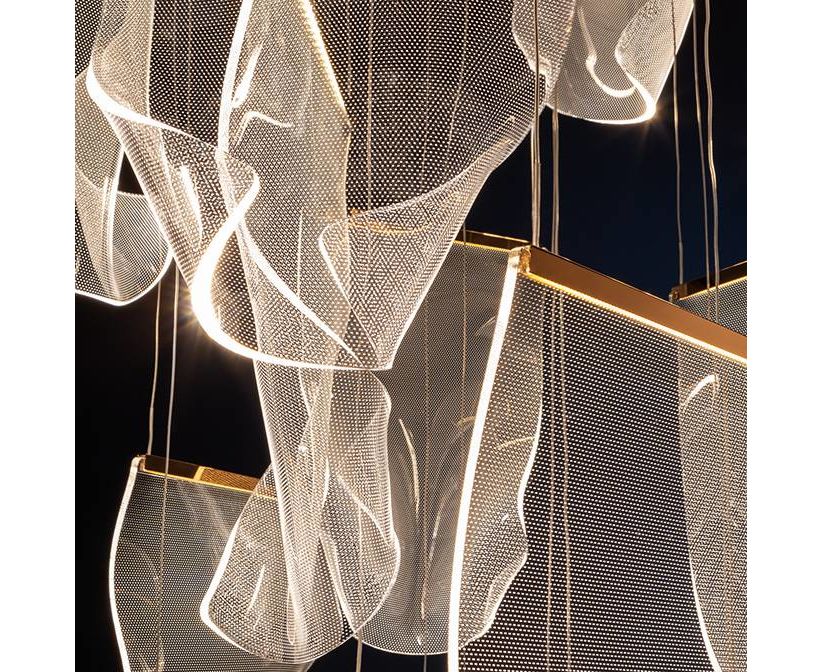 Подвесной светильник из металла цвета "красное золото", плафоны из формованного метакрилата с микропечатью и окантовкой из металла цвета "красное золото".
