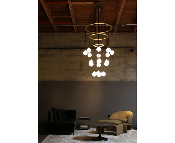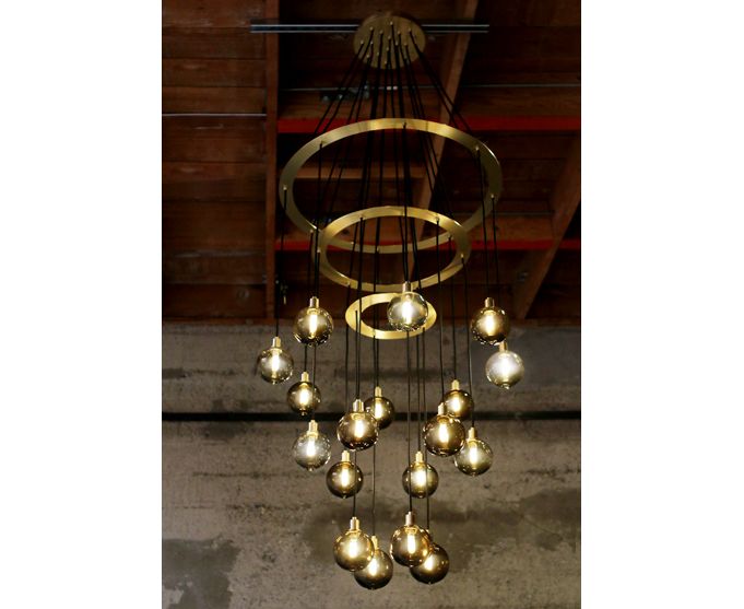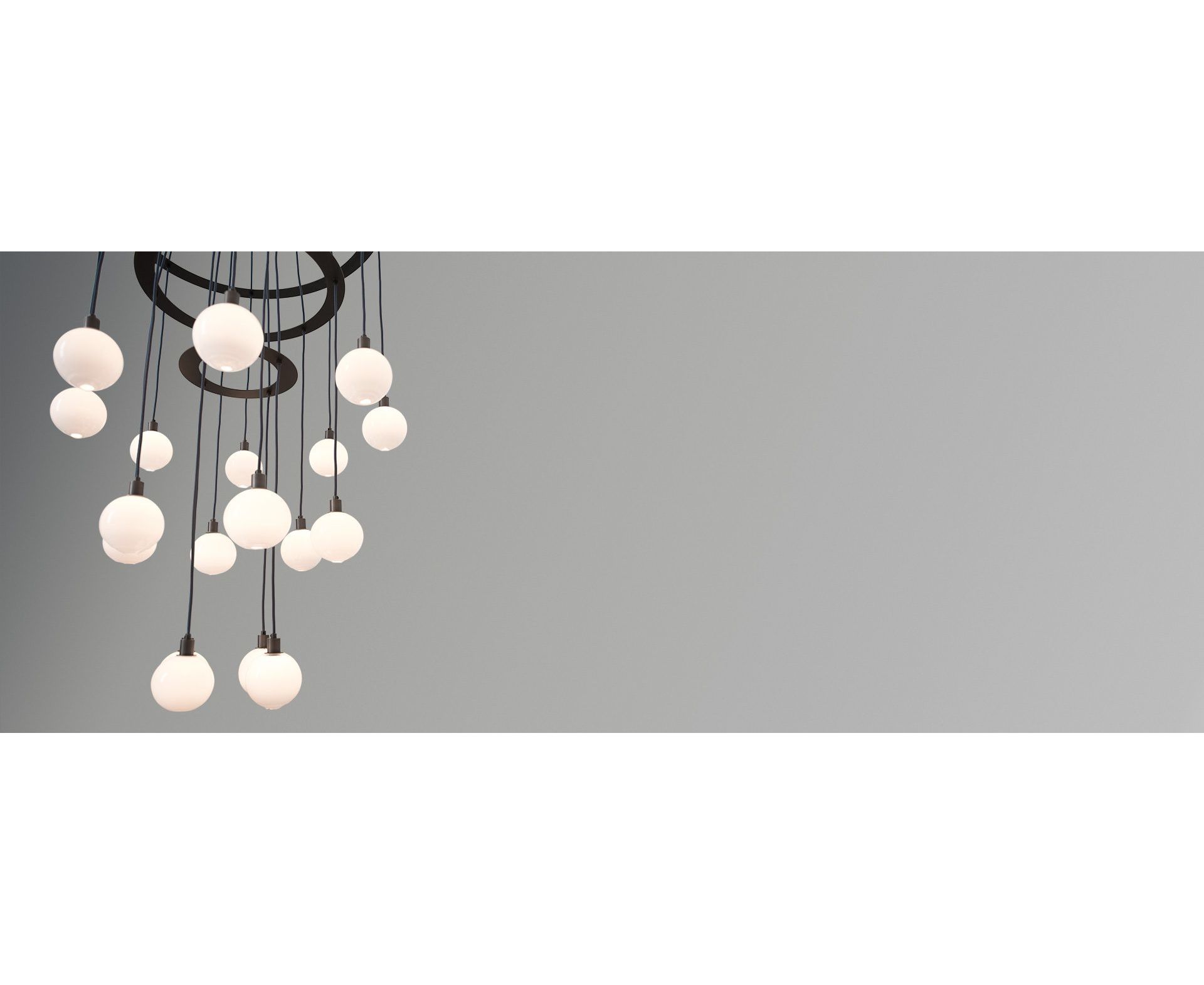 Люстра Drape Circle 18 состоит из 18 отдельных подвесок, собранных и поддерживаемых плоским кольцом. Каждый кулон имеет стеклянную сферу из выдувного стекла диаметром 11 см, подвешенную на обернутом тканью электрическом кабеле. Шнуры проходят через кольцо и равномерно распределены по окружности. Сферические стеклянные диффузоры имеют фирменные двойные окаймленные огнем горелки SkLO, которые показывают, где стекло разбито из трубы воздуходувки, что делает каждый из них уникальным.