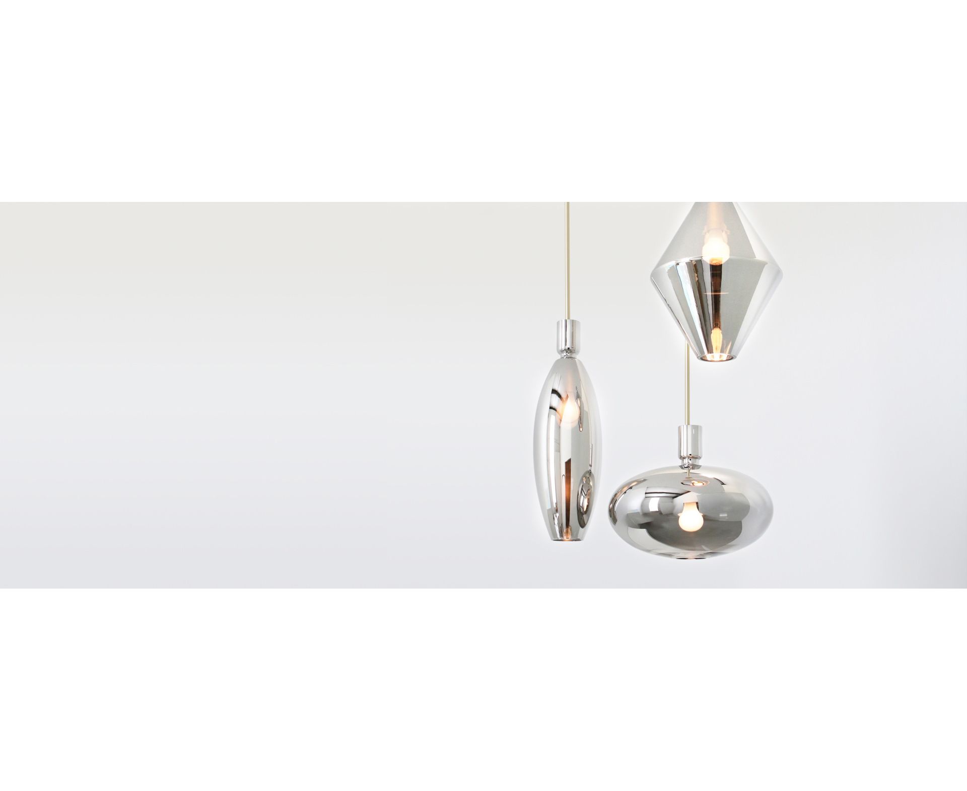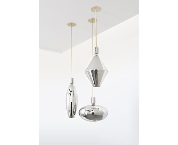 Отражающие подвески SkLO представляют собой серию подвесок из зеркального металлического стекла различной геометрической формы. Стекло зеркально отражается с помощью уникального процесса, который создает непрозрачный вид зеркала, когда свет выключен, но позволяет свету проходить при включении. Каждая форма имеет открытое отверстие внизу - шлифованное и отполированное. Зеркальные стеклянные жалюзи лежат на диске в конце жесткого латунного стержня - для доступа к лампочкам нужно либо пройти через открытое отверстие, либо осторожно поднять стекло над колбой.