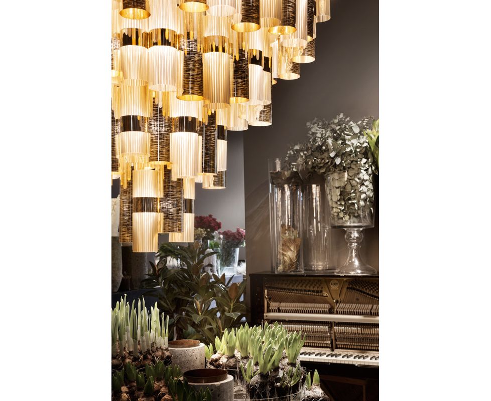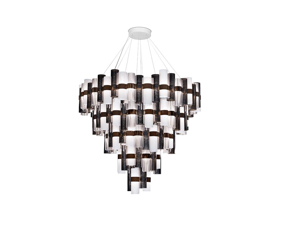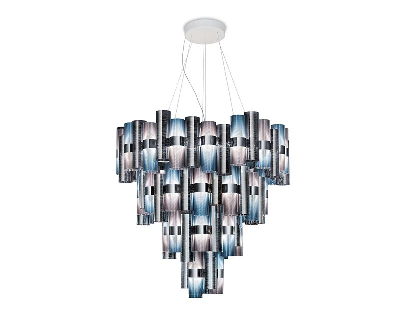 La Lollo и La Lollona - это дань бурным 50-м годам, вызывающим образы див и лампочек. Сложная градиентная хроматика, металлизация, кружевные узоры и геометрические узоры, которые украшают различные пространства с той же универсальностью, что и украшения на теле женщины. La Lollona 5 составляет 130 см. диаметром 132 из уникальных технополимерных цилиндров Slamp. Он поставляется в сверхплоской упаковке весом всего 30 кг; прост в установке, необычайно восхищает!
