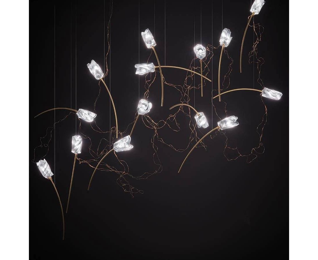 Подвесной светильник - образный, элегантный, невесомый. Tulip буквально украшает пространство плавающими цветами, которые были вылеплены вручную в соответствии с методами Slamp, что делает каждый из них уникальным. Почти невидимые кабели удерживают подвешенные цветы, которые распускаются из матовых латунных стеблей; Каждый из них расположен под определенными углами, чтобы создать ощущение естественной морфологии. Каждый тюльпан соединен с другим через ряд замысловатых медных проводов, проводящих низковольтное электричество. В коллекции представлены конфигурации из 7 или 14 цветов, ниспадающих каскадом из одной прямоугольной или круглой потолочной пластины из матовой латуни, или отдельно стоящие пучки из 14 цветов, которые могут быть установлены в соответствии с личными вкусами и доступным пространством. Светодиодные источники света входят в комплект и могут быть заменены автономно.