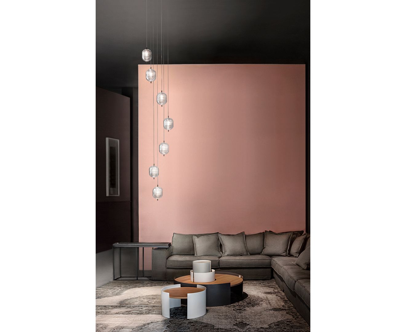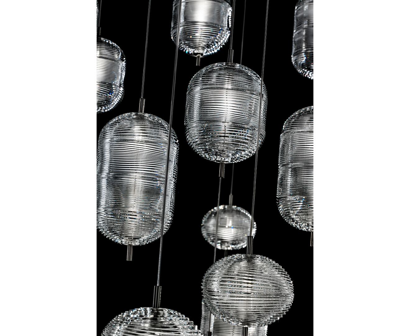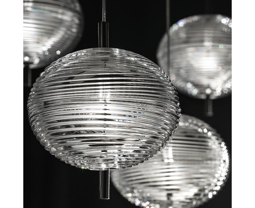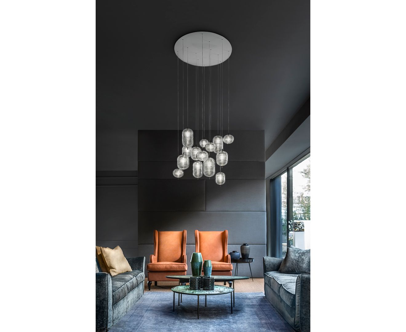 Уникальный дизайн светильника Jefferson относится к музыке и культовым образам в стиле 60-х годов в психоделическом искусстве. Атмосфера интерпретируется через драгоценный богемский кристалл с формами в разных эллиптических гранях, которые позволяют создавать различные версии светильника во множестве комбинаций с бесконечными и динамическими отражениями.