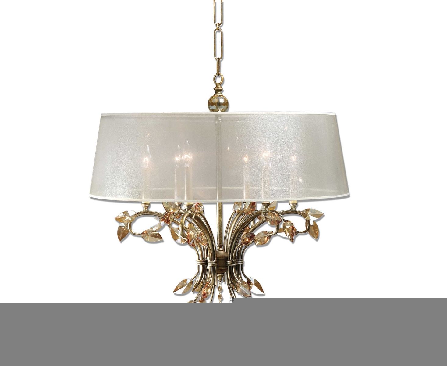 Полированный золотой металл с золотыми листьями из тикового хрусталя и абажуром из шелковистой ткани цвета шампанского.
