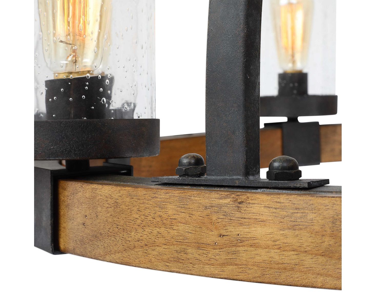 Толстый корпус из настоящего деревянного блока, выполненный в полутонах, с абажуром из прозрачного стекла. Отсылка к промышленному дизайну проявляется в обернутой железом раме. Металлическая работа выполнена в глубокой бронзовой отделке с эффектом выветривания, с легкой текстурой и черным состариванием.