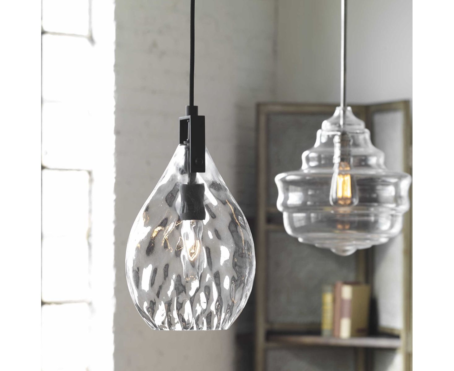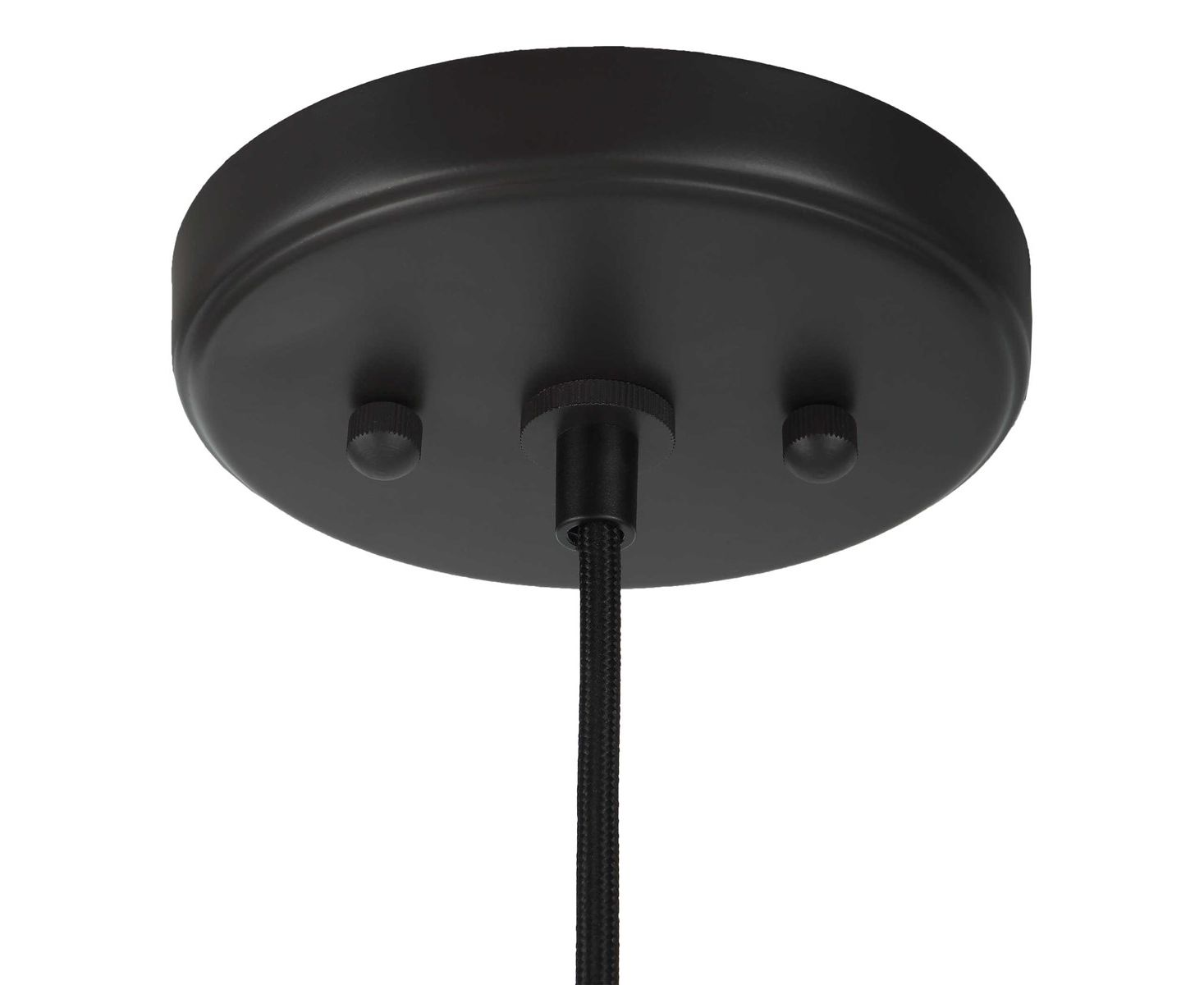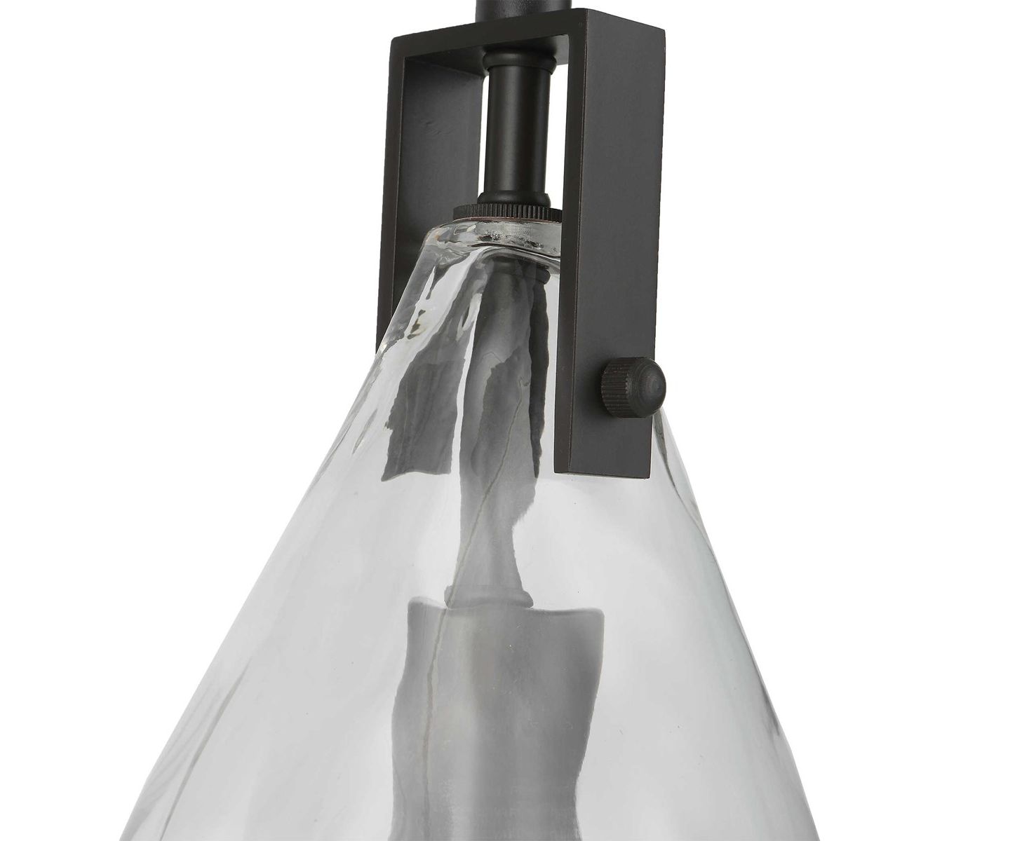 Небольшая подвесная лампа в матово-черном исполнении с плоским прозрачным водяным стеклом каплевидной формы. Если смотреть спереди, плафон имеет каплевидную форму, а сбоку — более плоский внешний вид.