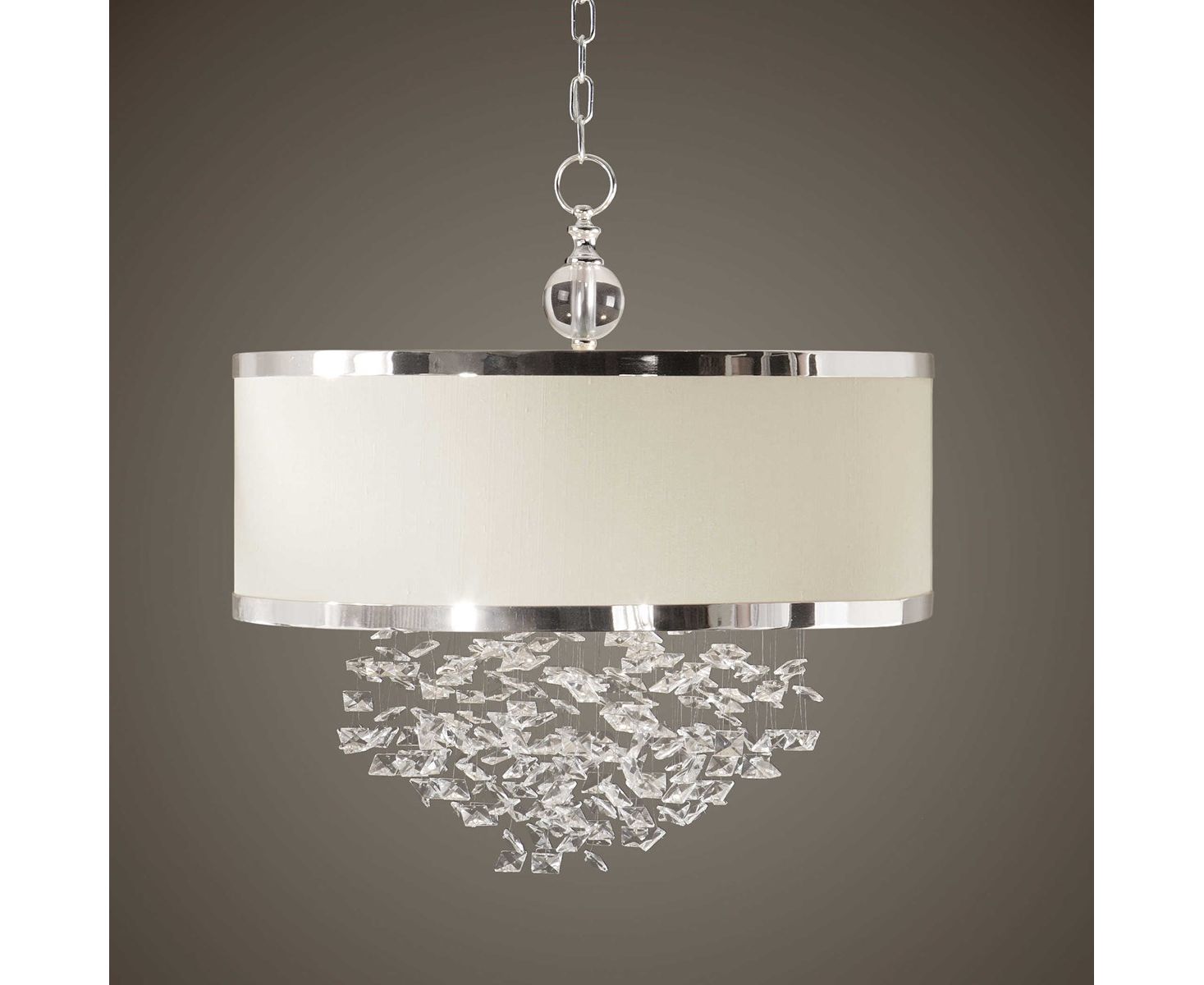 Классическая привлекательность хрусталя обновлена для современных утонченных вкусов: свободно падающие кристаллы и абажур из белого льняного барабана с серебряной окантовкой.