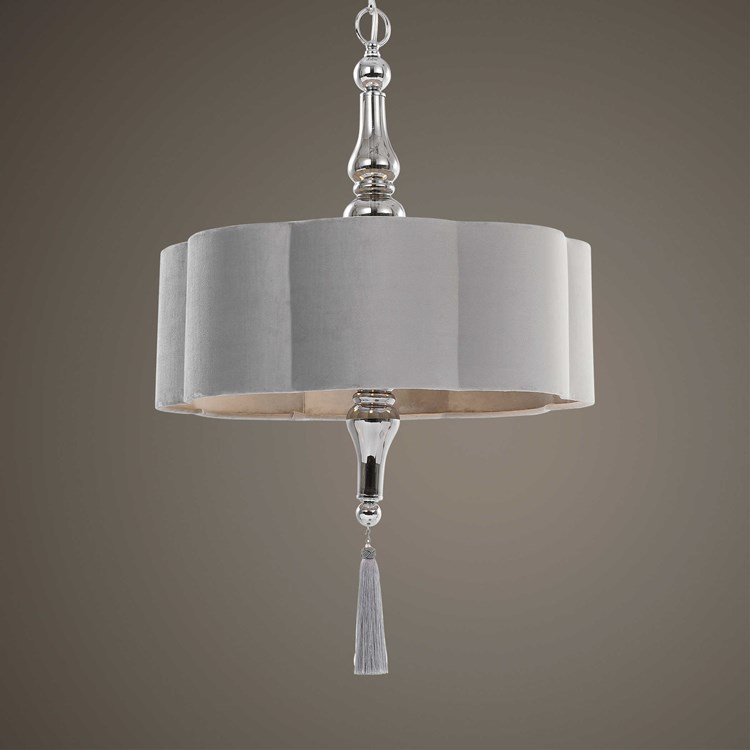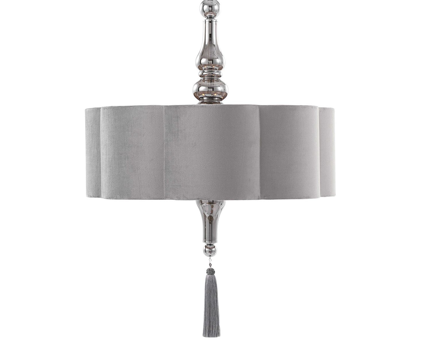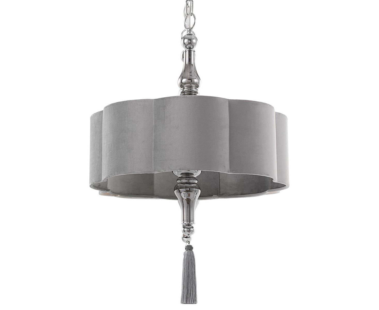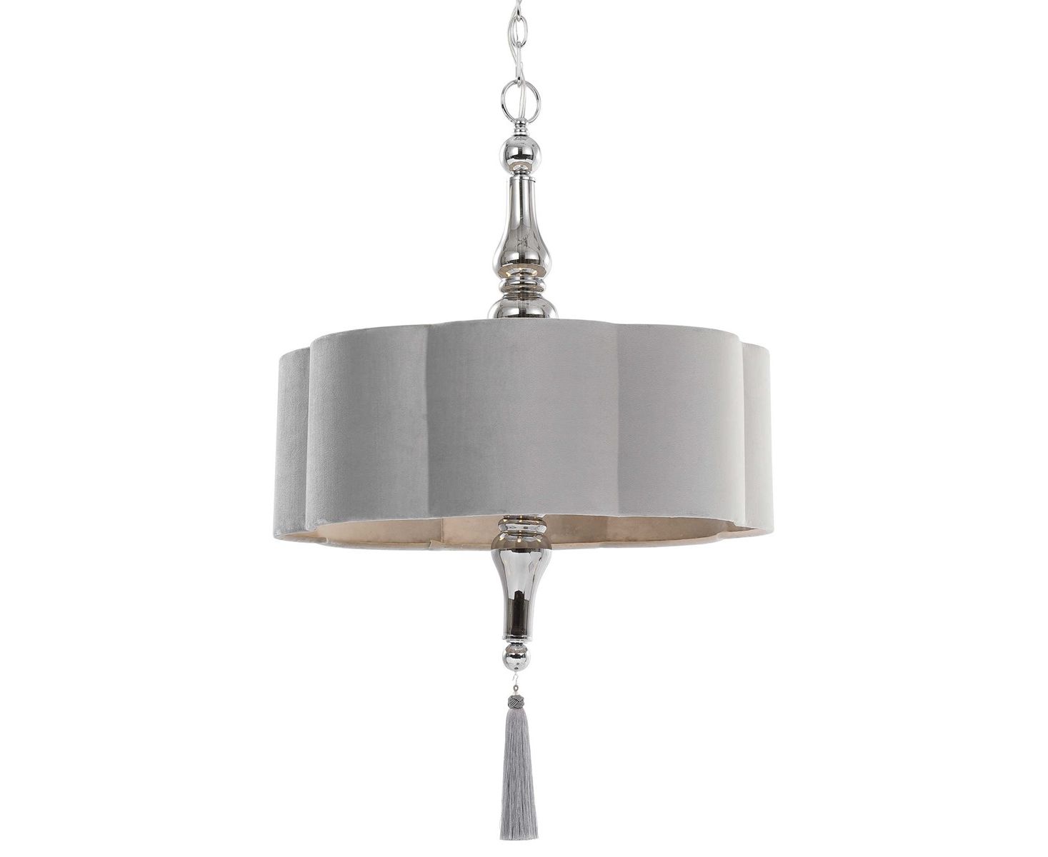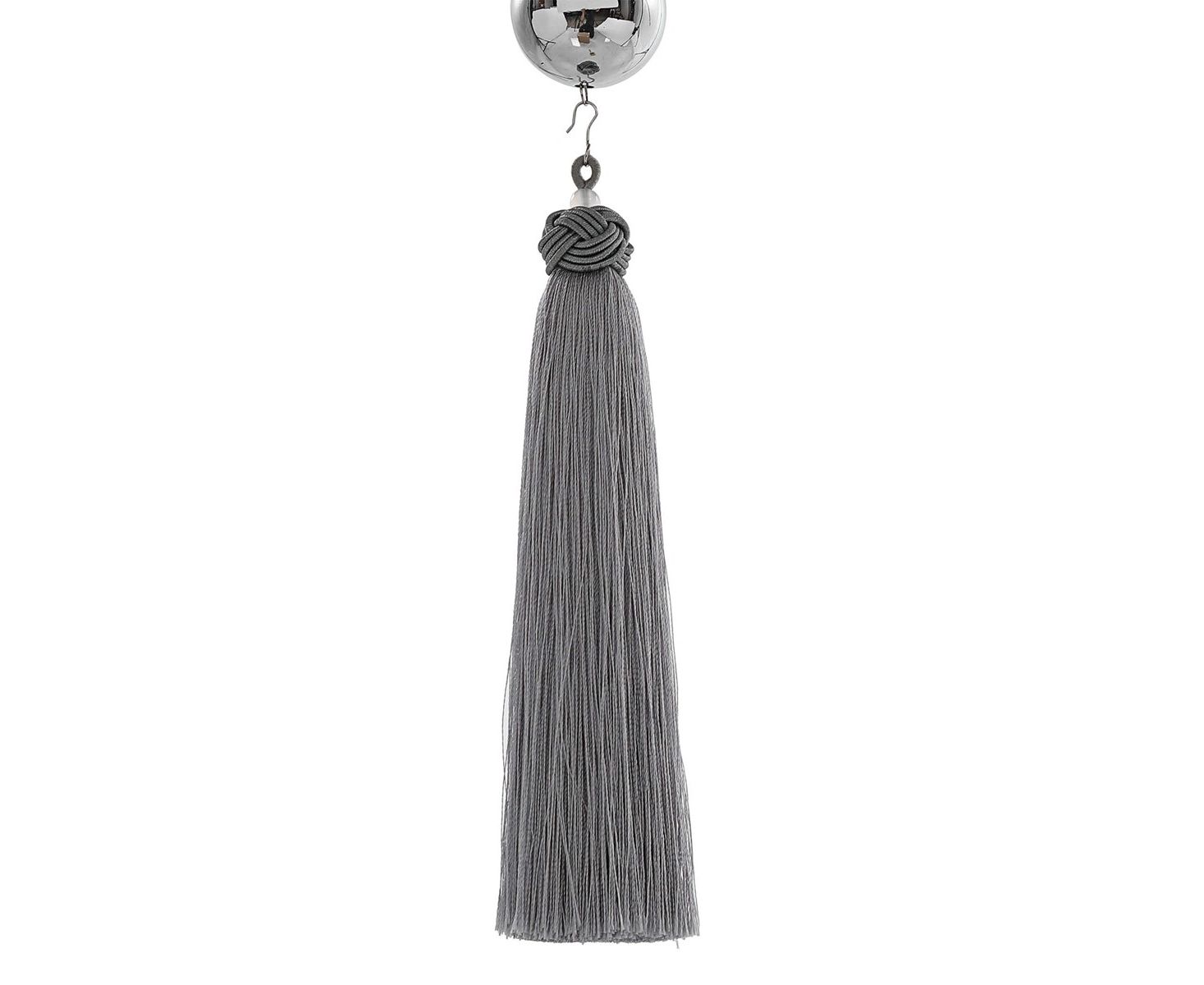 Неподвластная времени, изысканная и роскошная подвесная лампа с рифленым серебристым оттенком украшена вставками из дымчатого стекла с покрытием на центральной колонне и хромированной отделкой. Роскошное шелковое серебристо-серое навершие с кисточками и хромированное шаровое навершие, позволяет настроить его в соответствии с вашим интерьером.