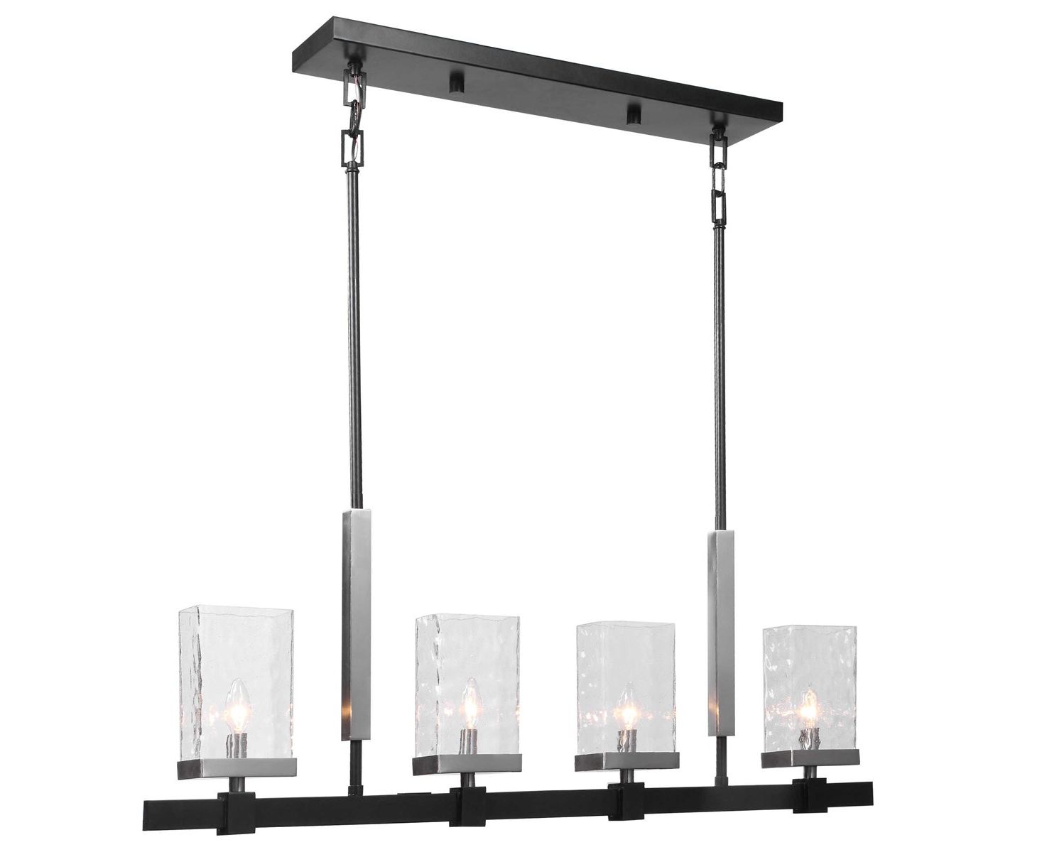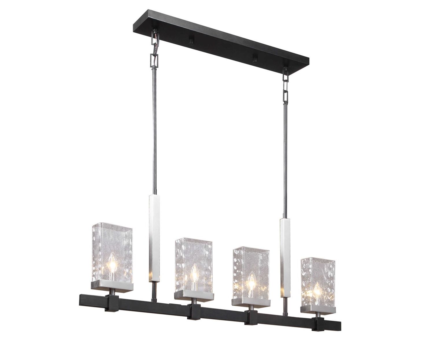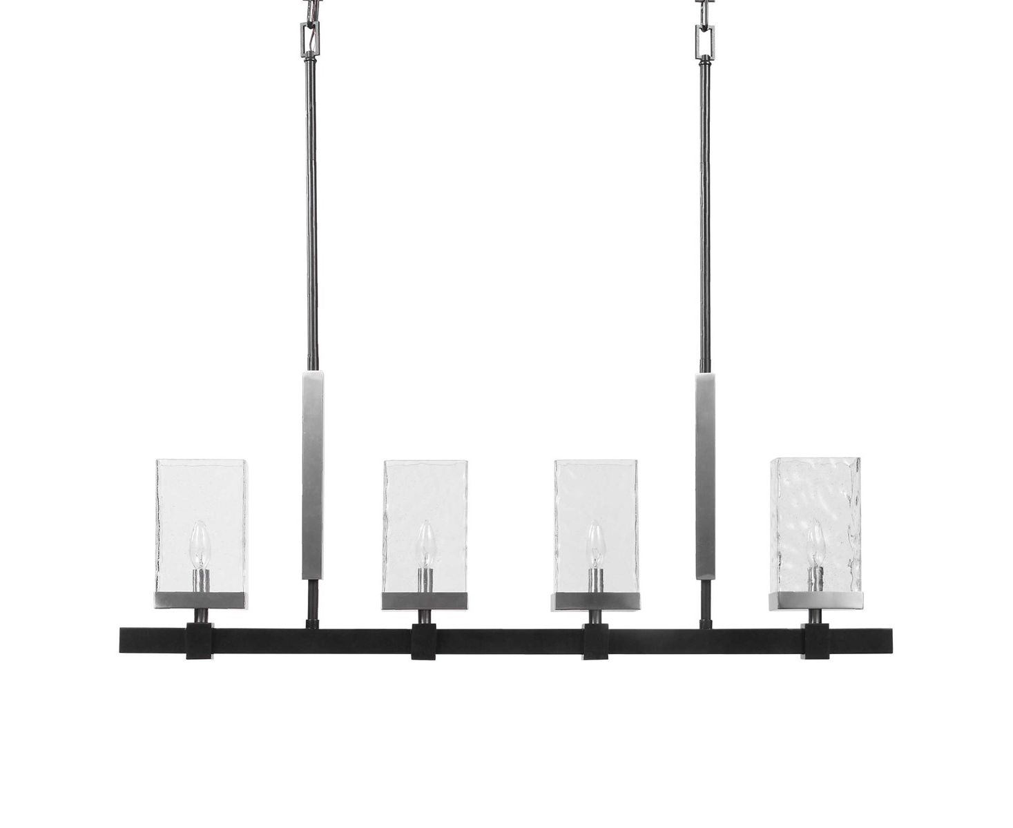 Подвесной светильник с текстурированной черной отделкой и вставками из матового никеля, оснащен уникальным прямоугольным прозрачным стеклом с водянистым покрытием и микрозернистостью.