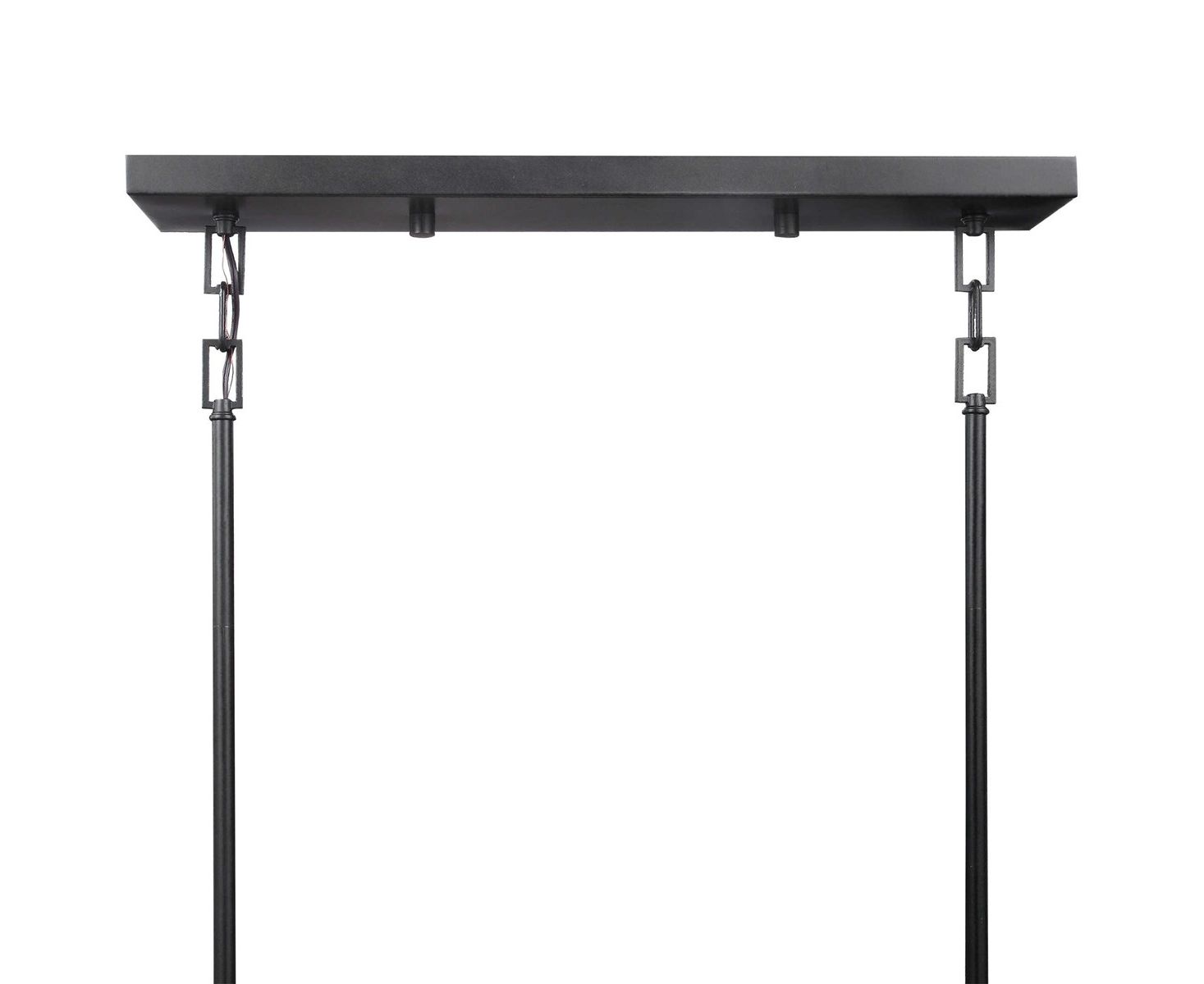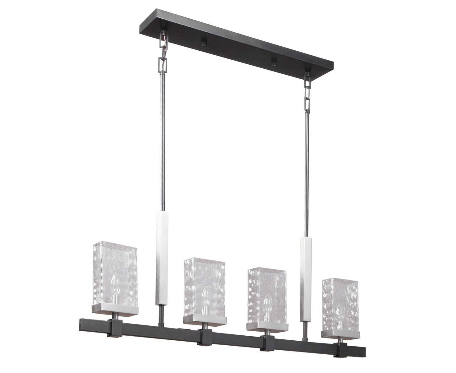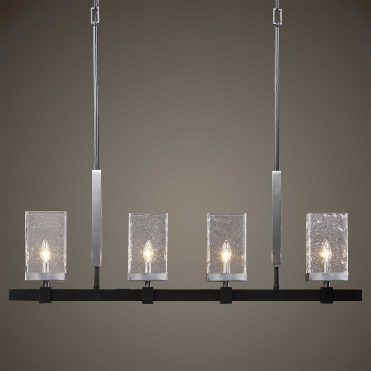Подвесной светильник с текстурированной черной отделкой и вставками из матового никеля, оснащен уникальным прямоугольным прозрачным стеклом с водянистым покрытием и микрозернистостью.