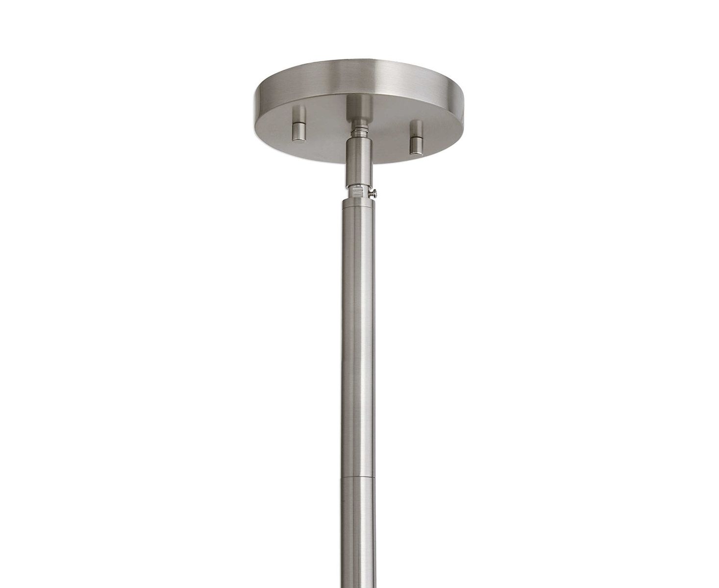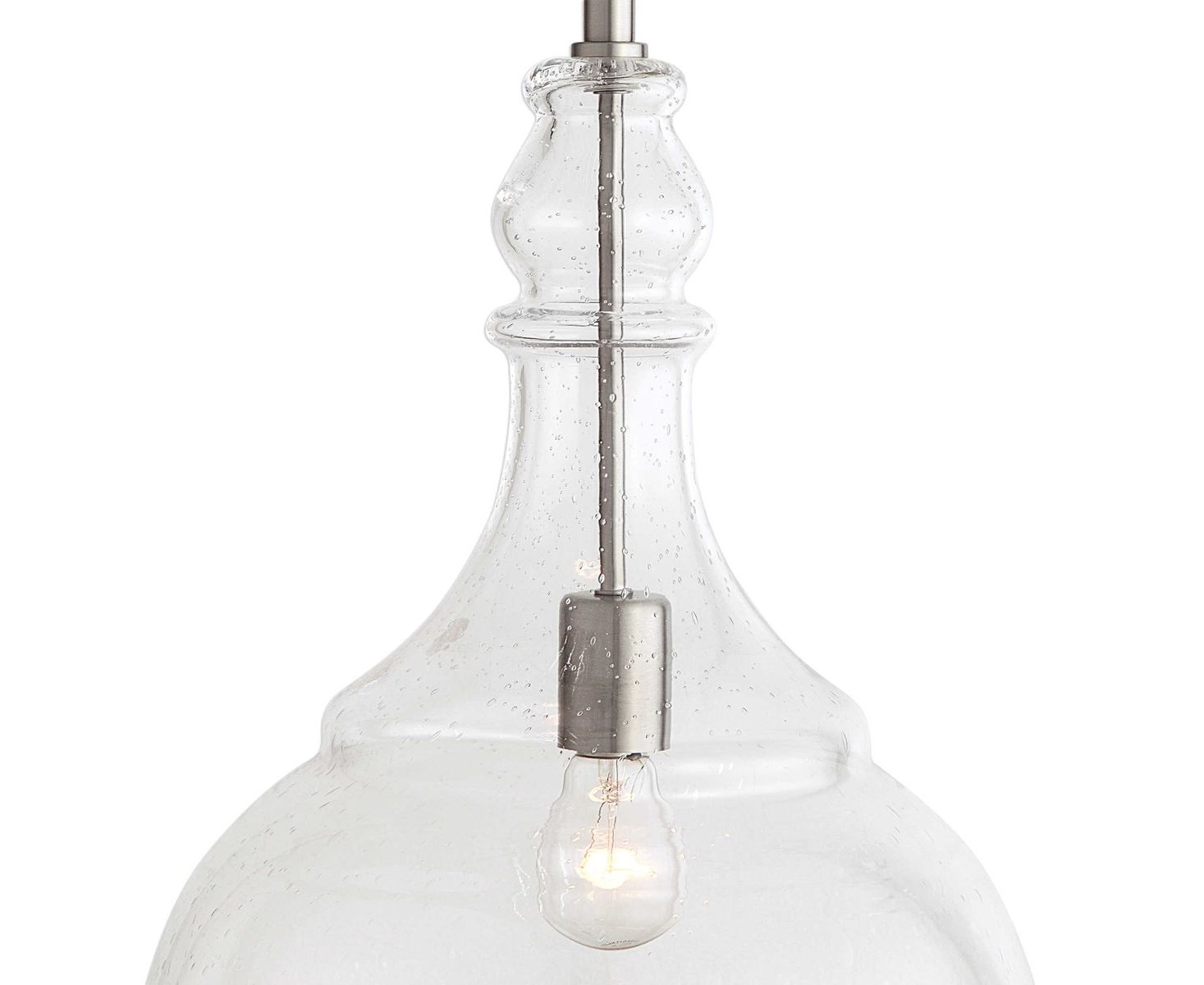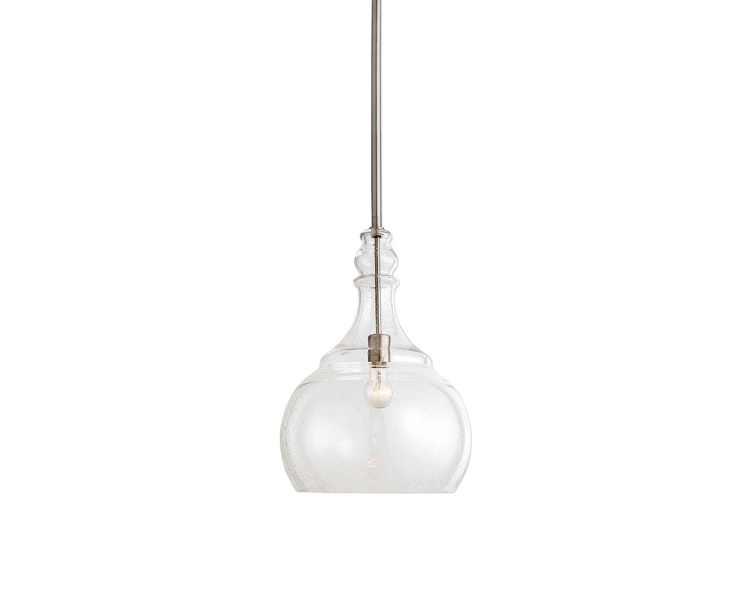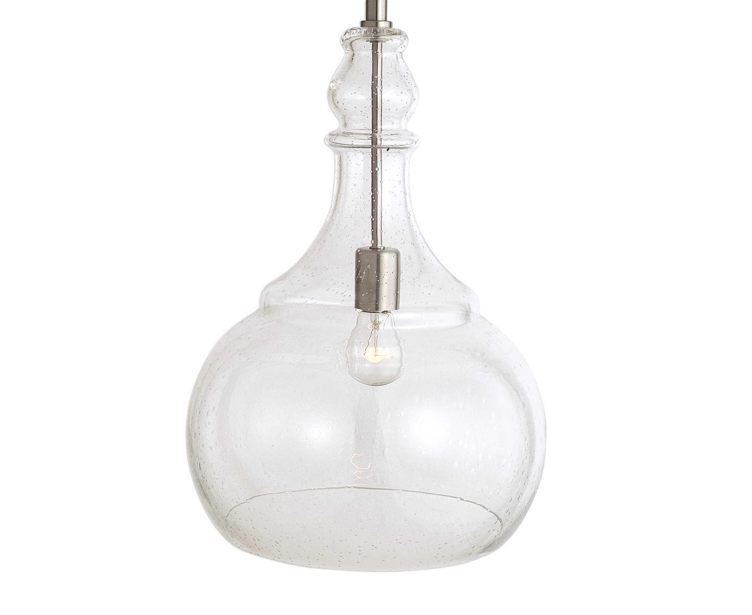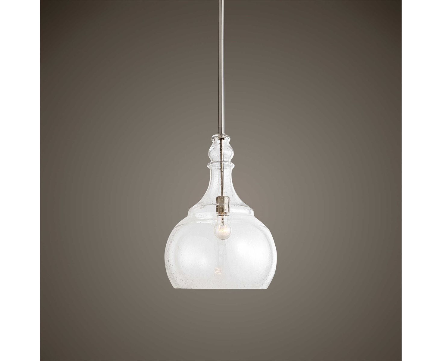 Подвесная лампа в виде капли из прозрачного зернистого стекла с металлической фурнитурой из полированного никеля легко вписывается во многие современные стили интерьера.