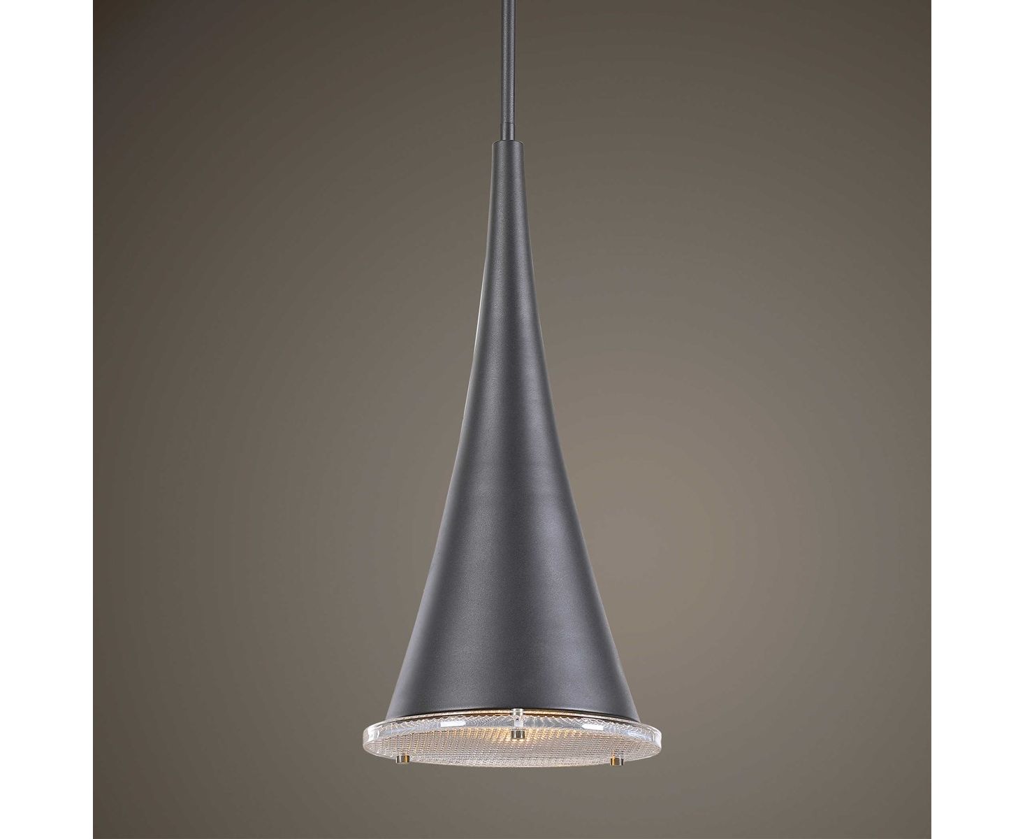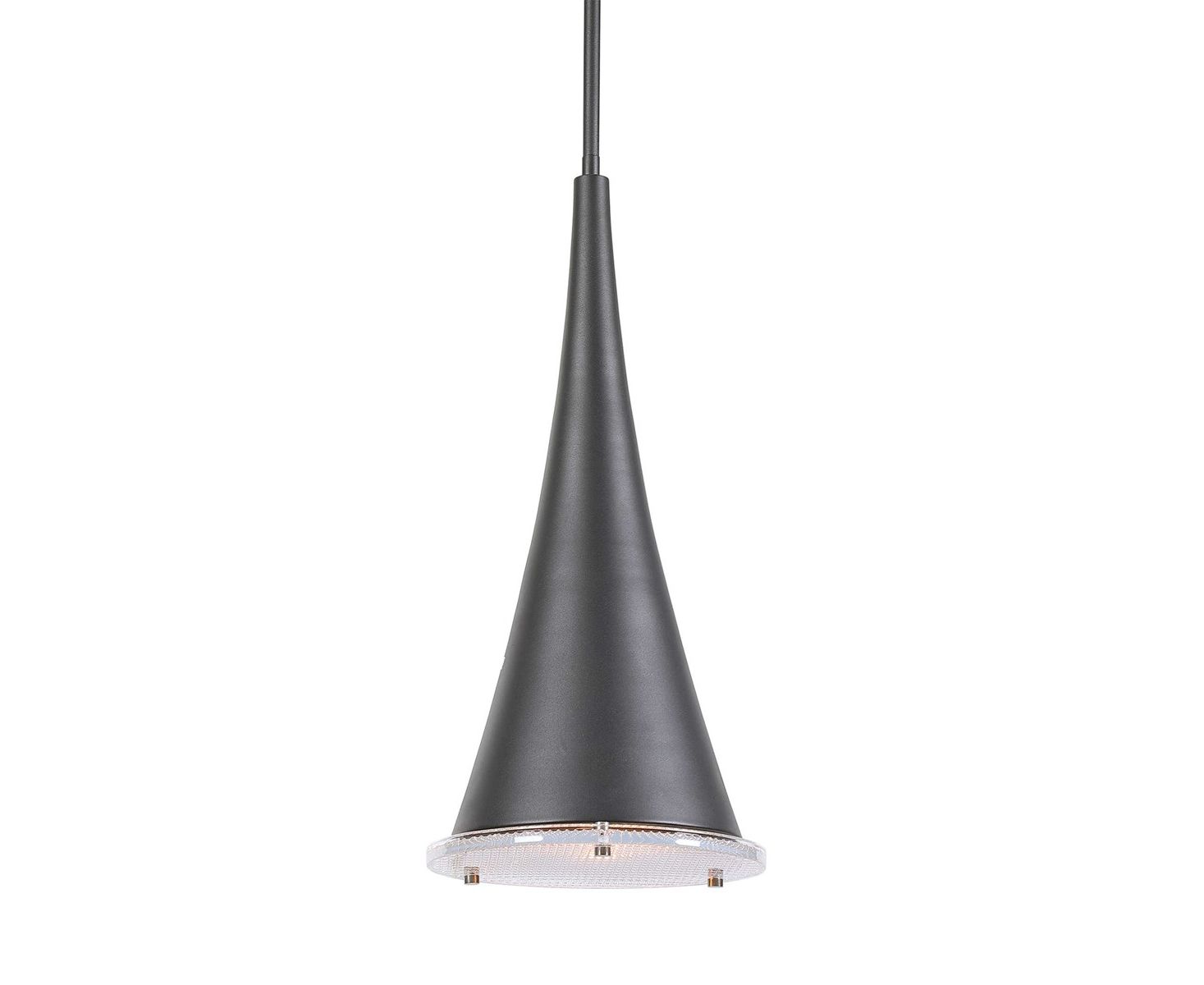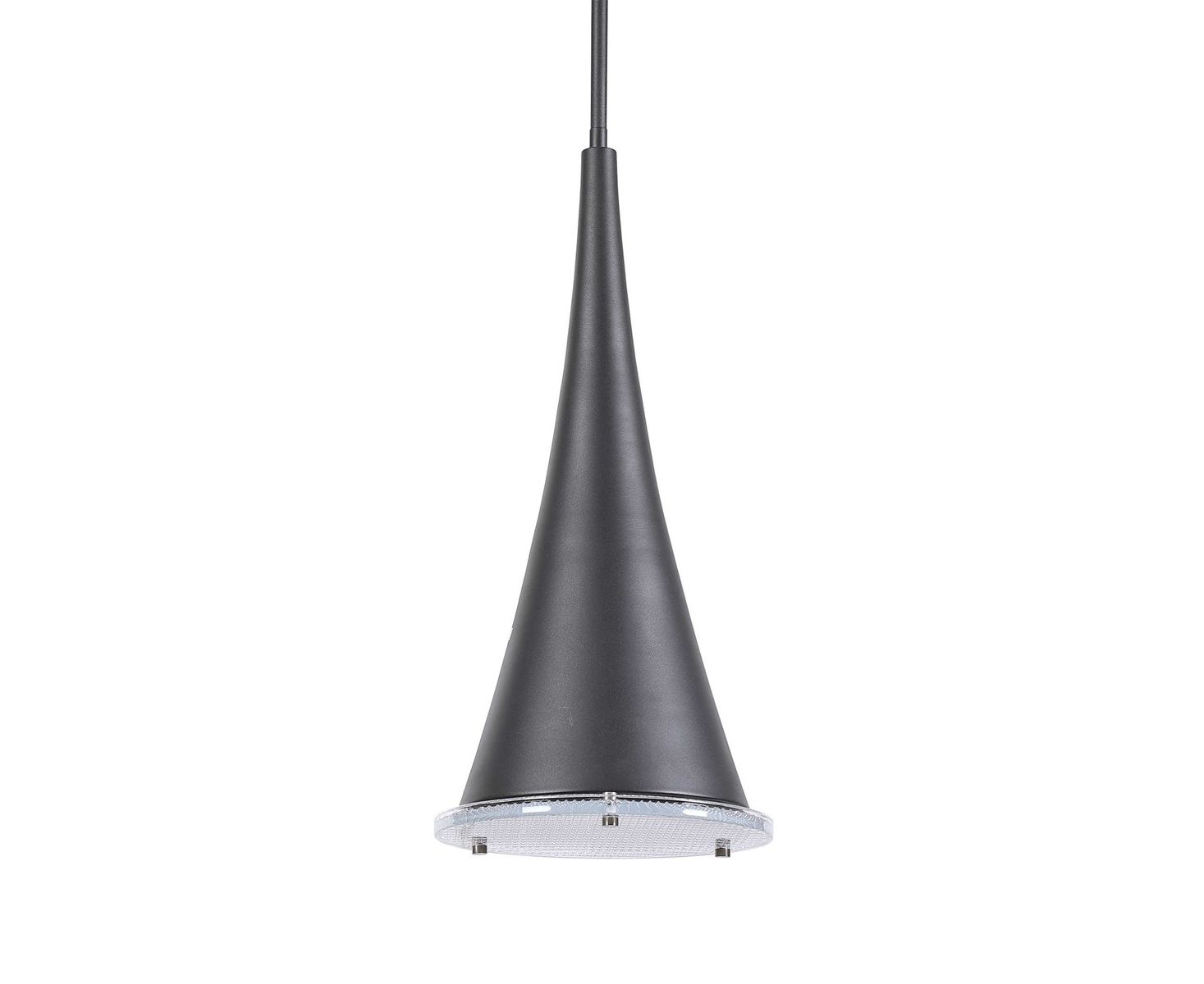 Драматический удлиненный конус на 1 лампу. Подвеска с песочной фактурой черного цвета, усиленная нижним диффузором из толстого призматического стекла.