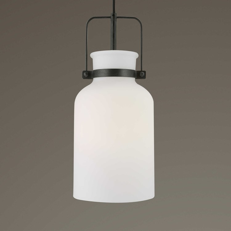 Очарование фермерского дома и мягкая промышленная простота придают этому мини-подвесному светильнику чистый и традиционный вид. Из белого молочного стекла в форме старинной бутылки для молока с текстурированной черной отделкой.