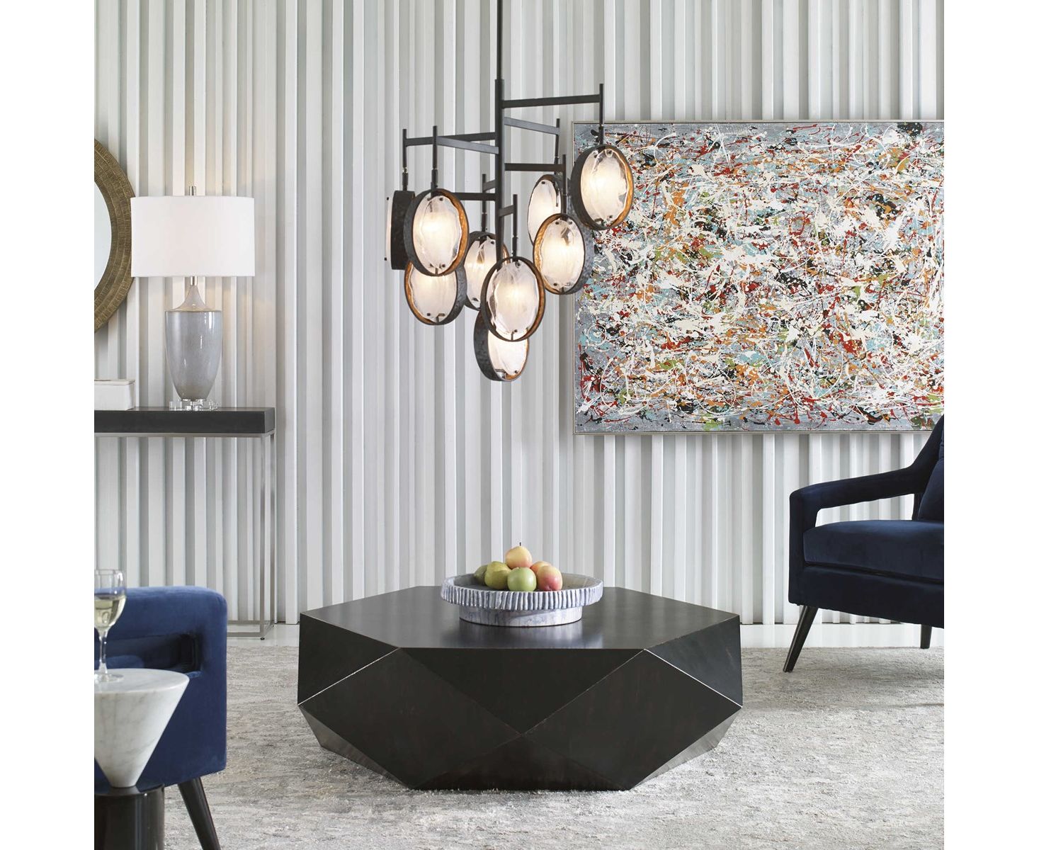 Кольца из темной чеканной бронзы с тонкой золотой внутренней частью. Каждое кольцо, вдохновленное современным дизайном середины века, содержит два прозрачных и белых стеклянных овала ручной работы.