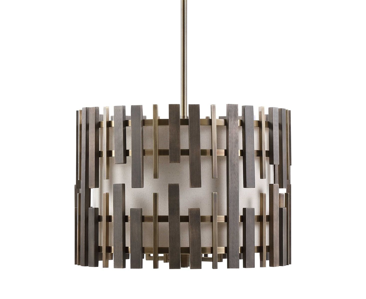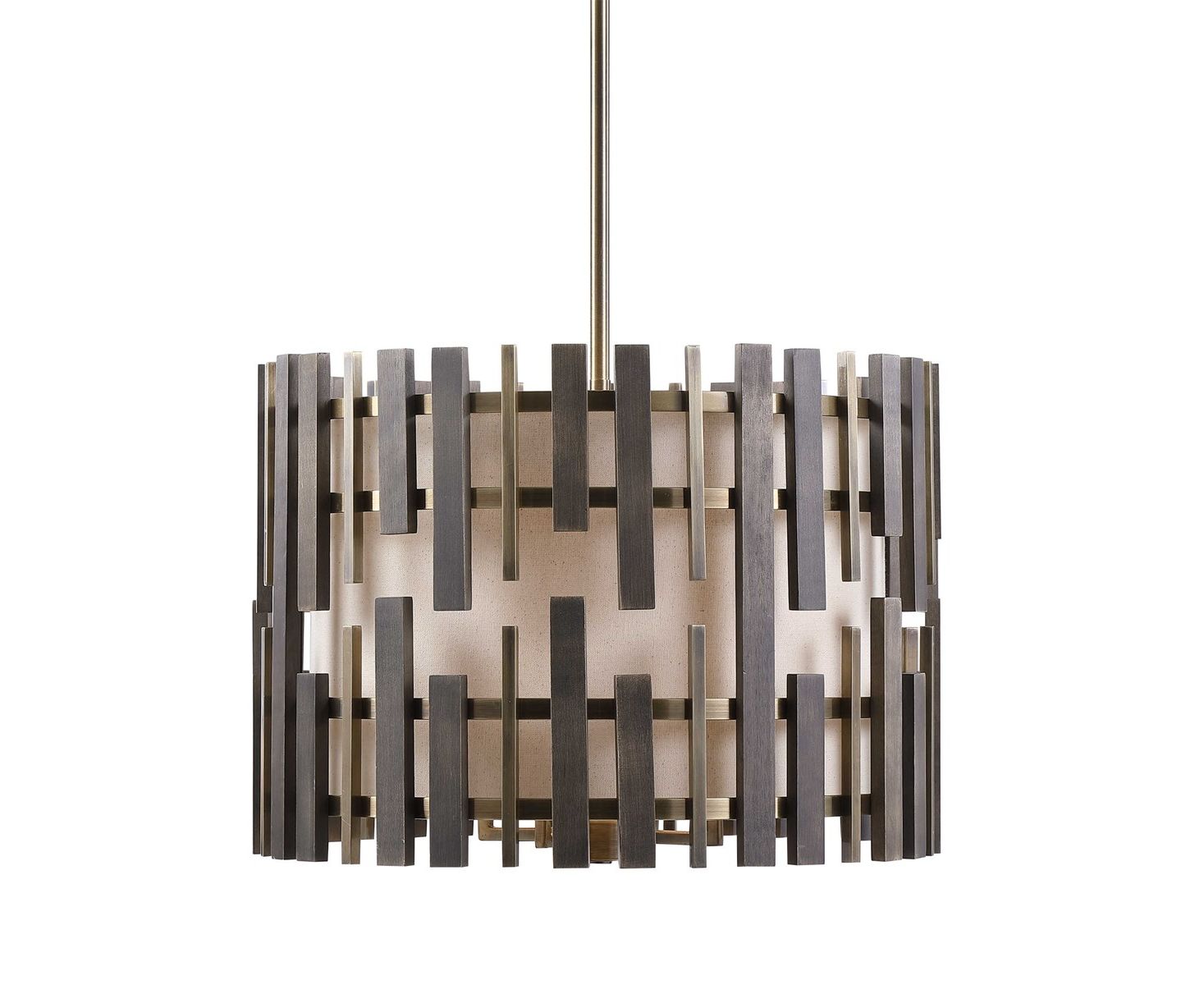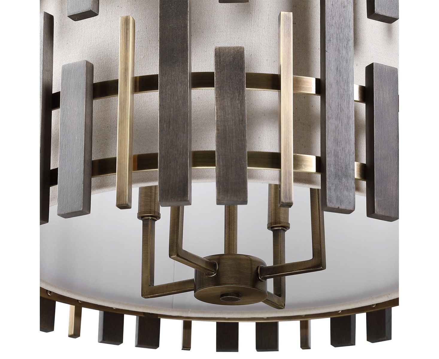 Вертикальные деревянные бруски теплого серого цвета сочетаются с антикварными латунными прутьями, что придает внешнему оттенку подвески Myers на 4 лампы большую детализацию. Внутренний плотный внутренний абажур - акцент из кремовой льняной ткани.
