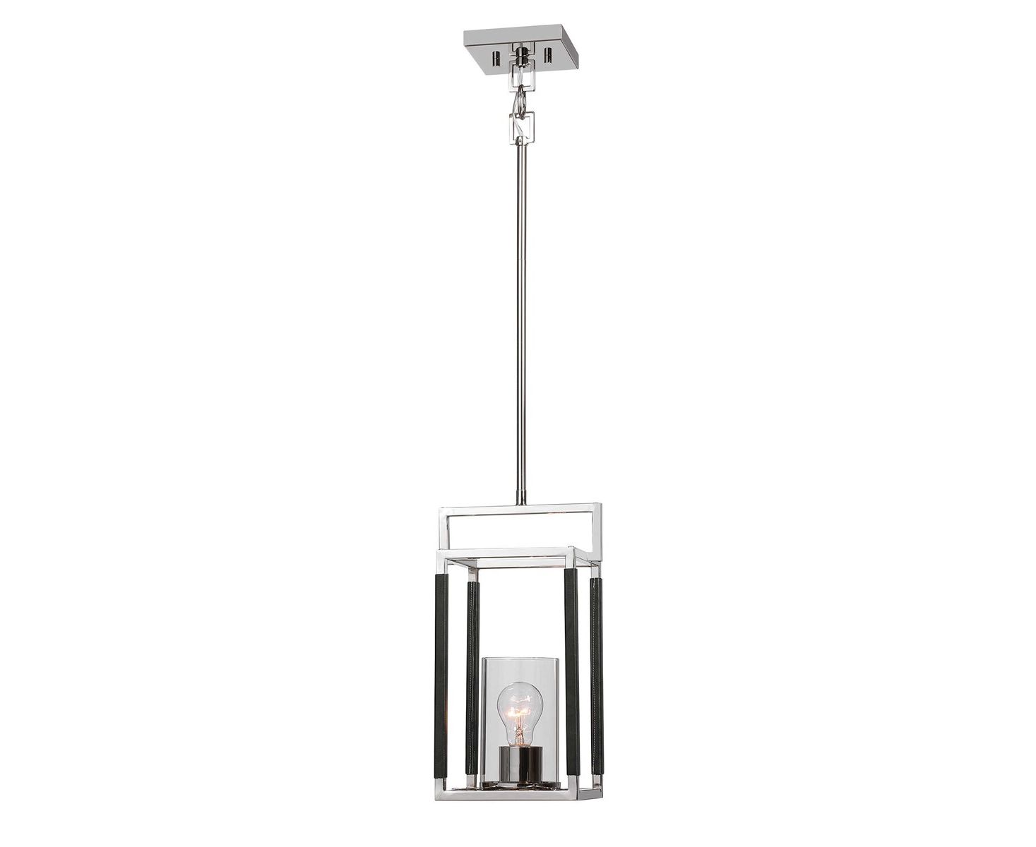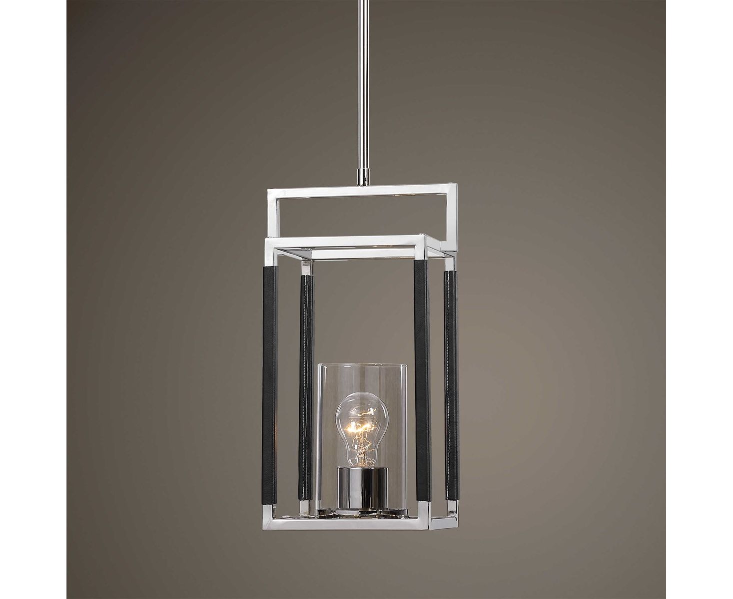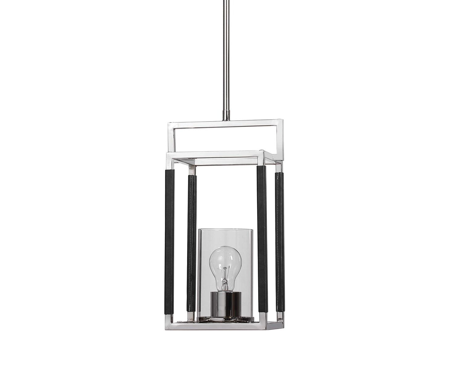 Чистые геометрические прямоугольные и квадратные линии из полированного никеля на мини-подвеске на 1 лампу дополнены текстурой из черной кожи, сшитой вручную.