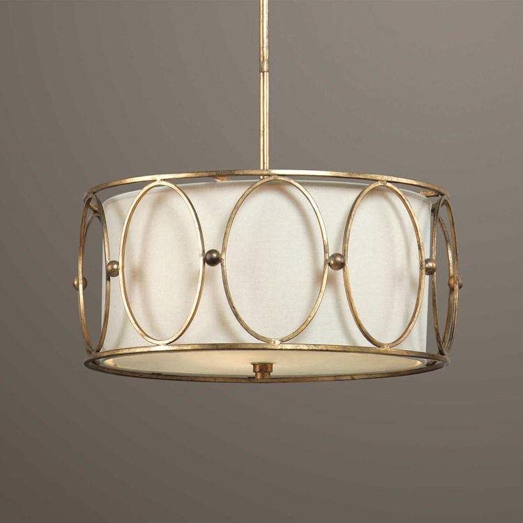 Классический подвесной абажур с овальной рамкой с рисунком из старинного сусального золота и подкладкой из бежевой льняной ткани.