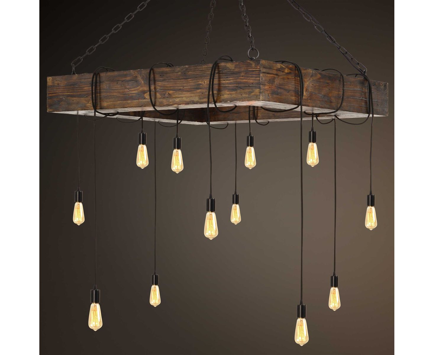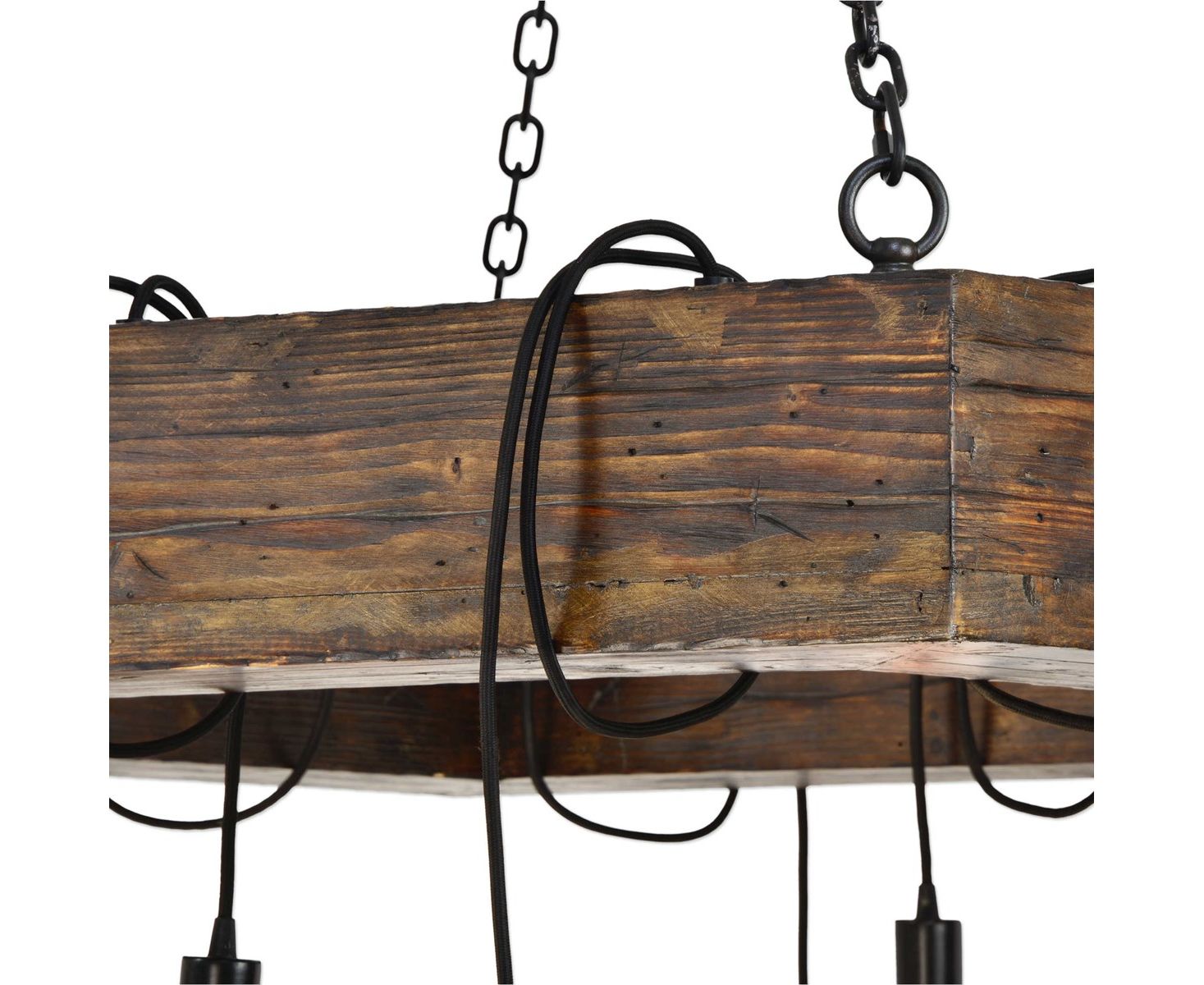 Грубая подвеска с рельефными узорами из окрашенного дерева с элементами из темной бронзы и тяжелой цепью. Эта подвеска включает лампы старинного декоративного стиля BT58 мощностью 9-60 Вт, которые подвешены на покрытых тканью шнурах, которые обертывают вокруг дерева, усиливая его деревенскую привлекательность.