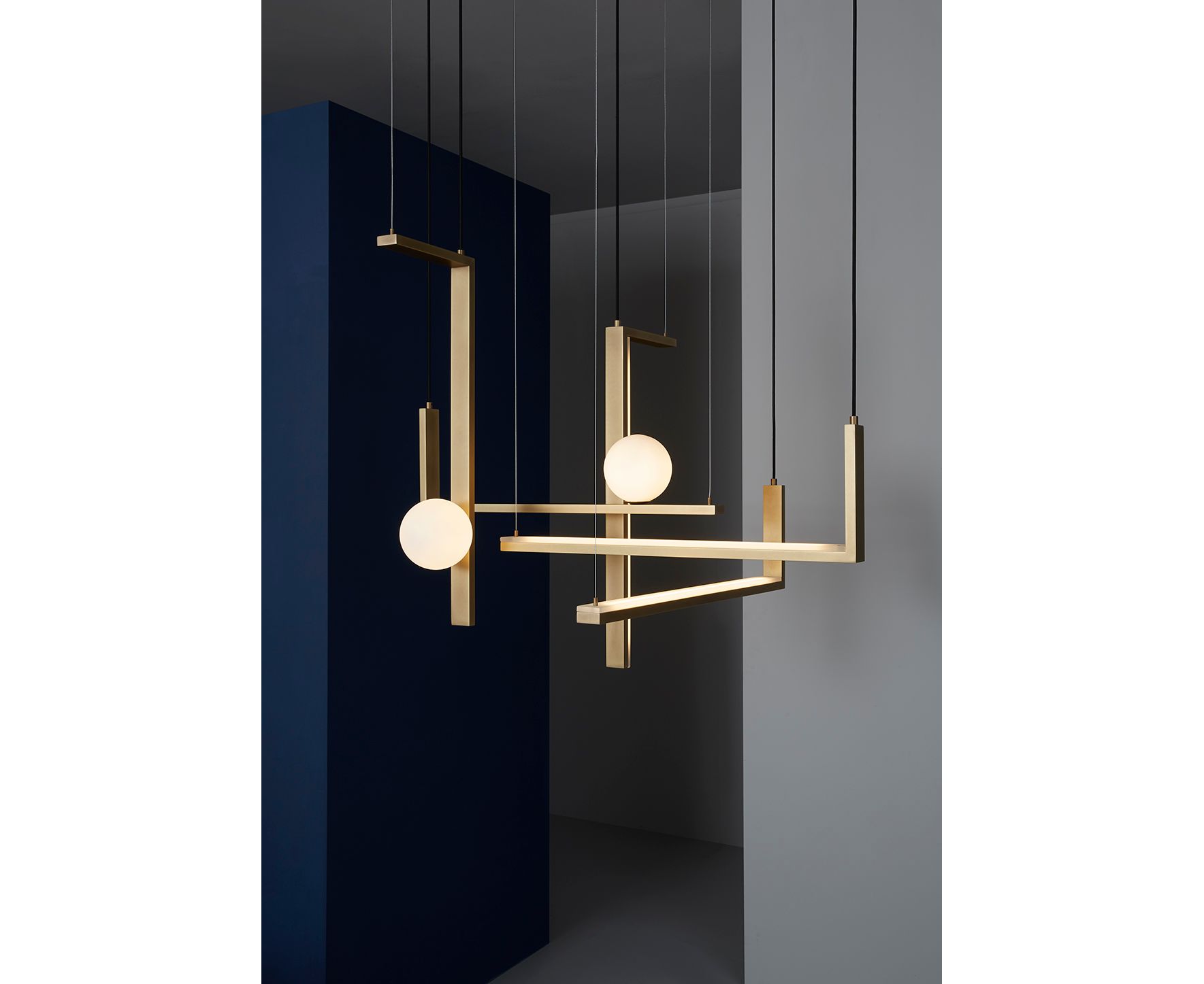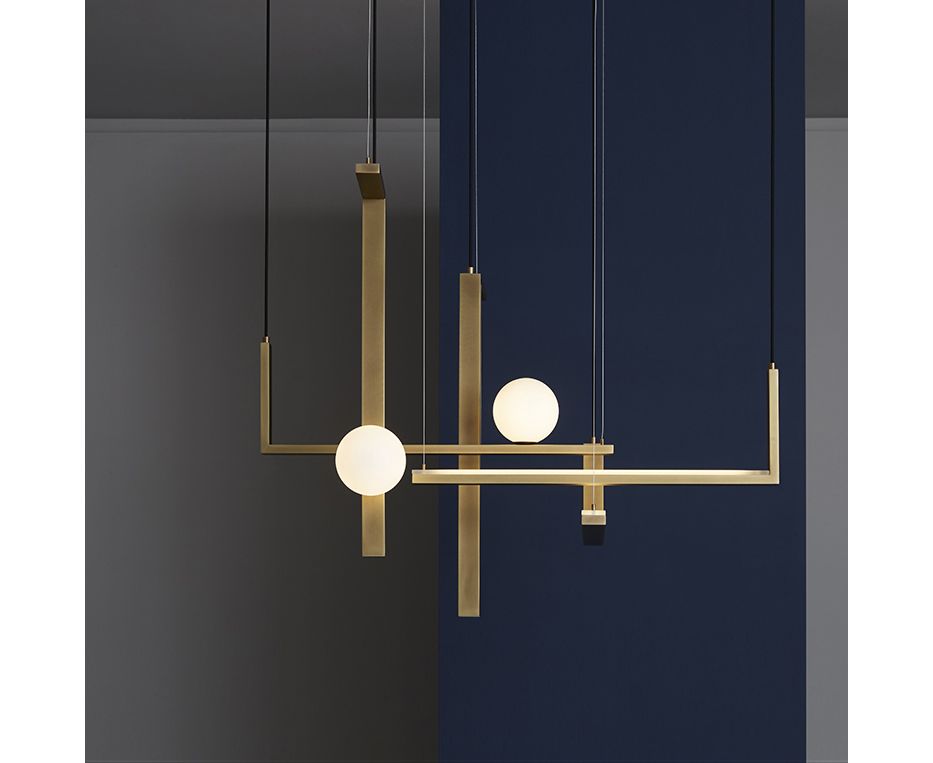 Подвесной светильник с рассеянным светом. Полированная структура из натуральной латуни, состоящая из смешанных элементов с шариками из сатинированного выдувного стекла и диффузорами из сатинированного стекла. Черные тканевые шнуры и стальные тросы с системой быстрой фиксации.