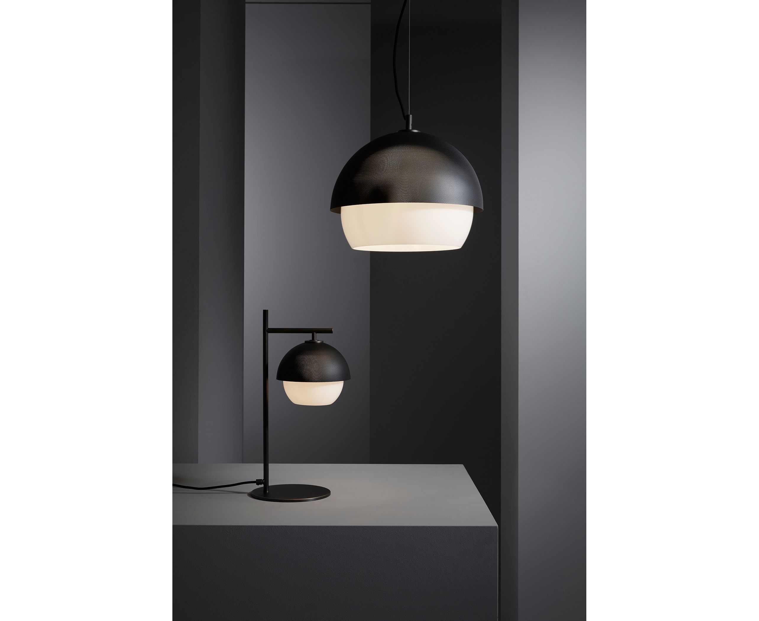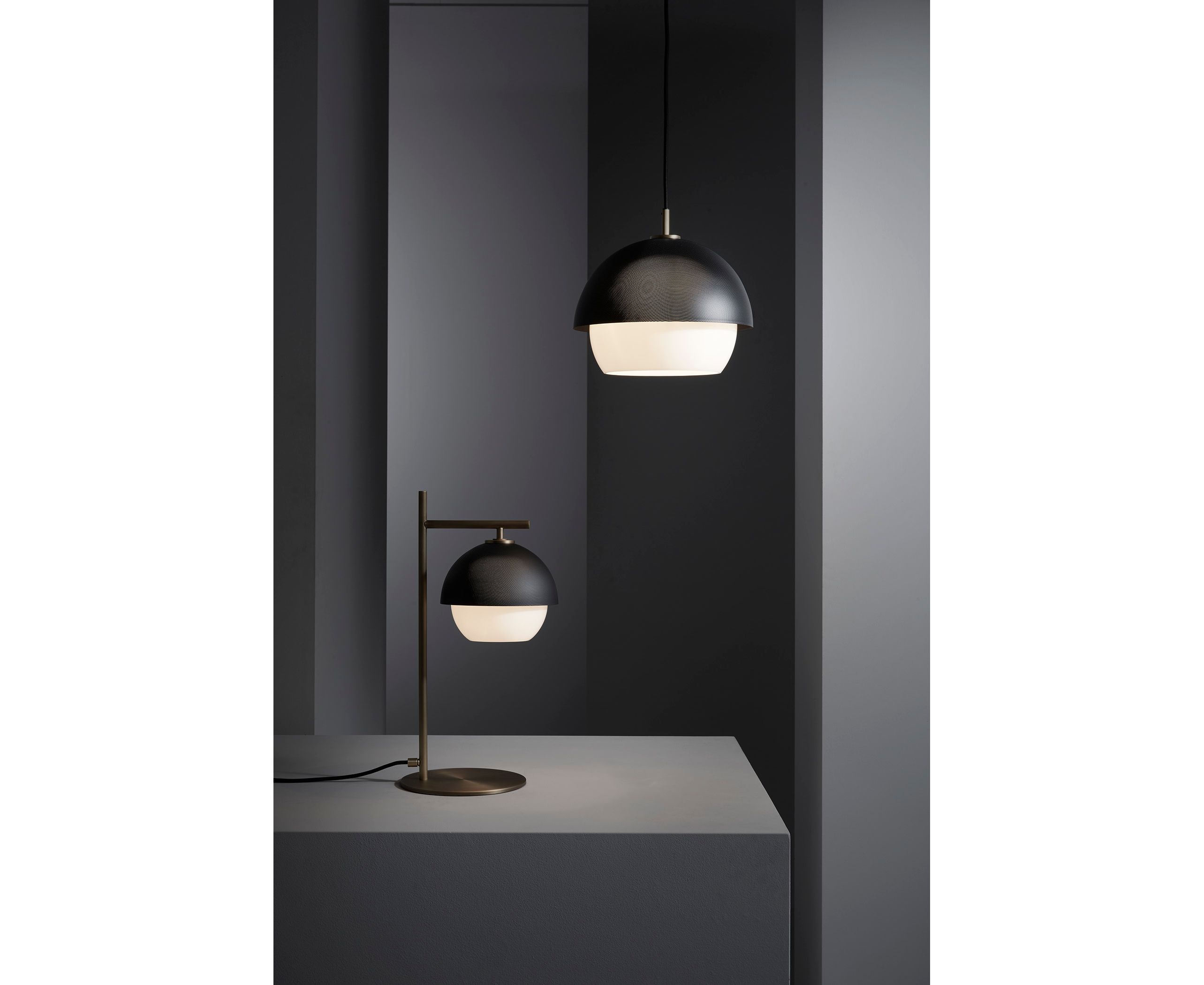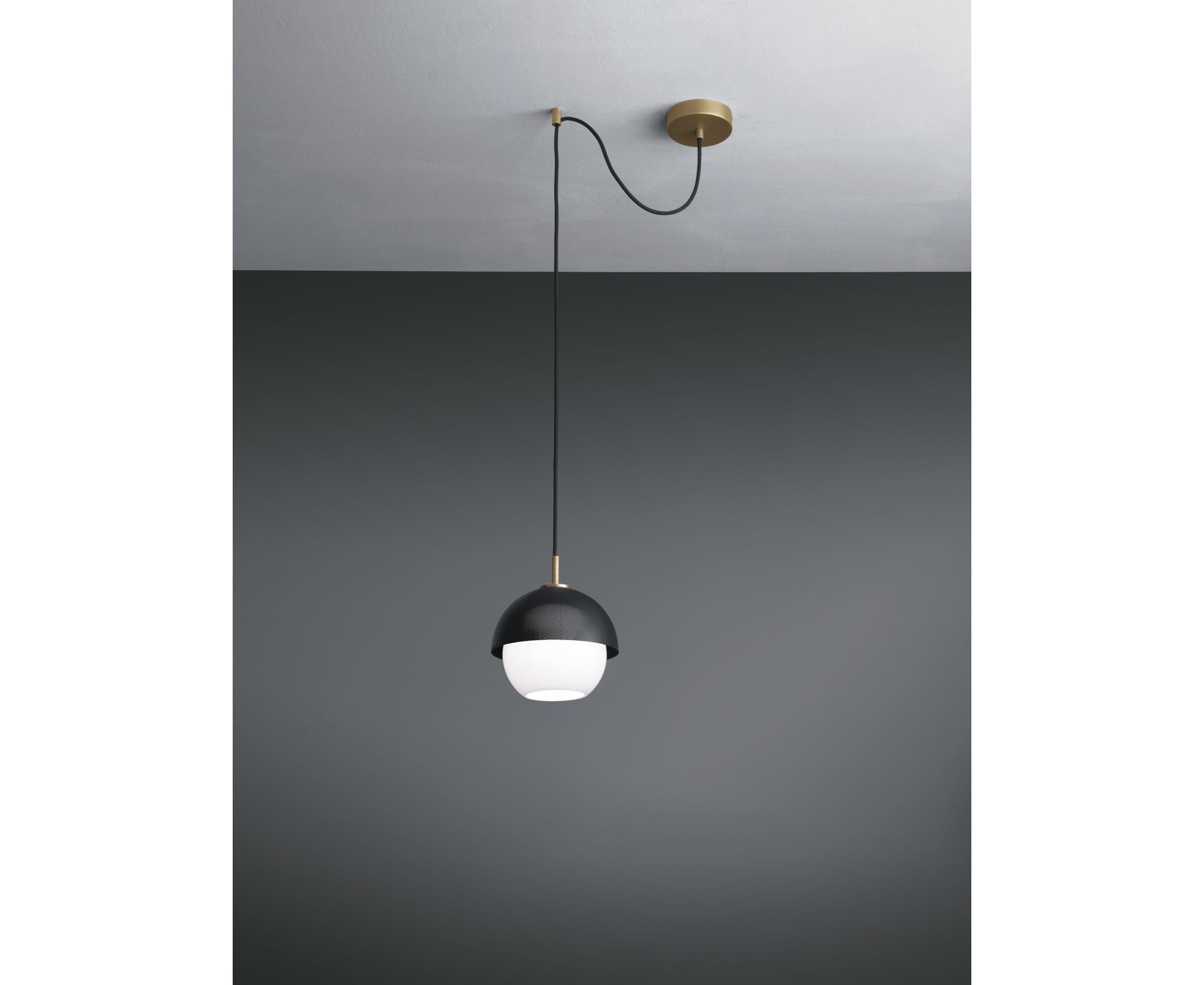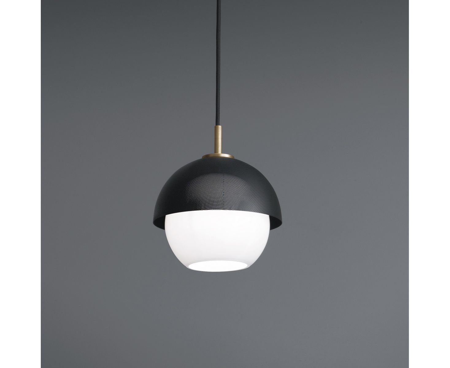 Этот подвесной светильник создает рассеянный свет. Его светлая или темная полированная латунная структура идеально подходит для различного использования. Элегантный металлический микроперфорированный абажур, доступный в двух цветах, смягчает яркость диффузора из выдувного стекла.