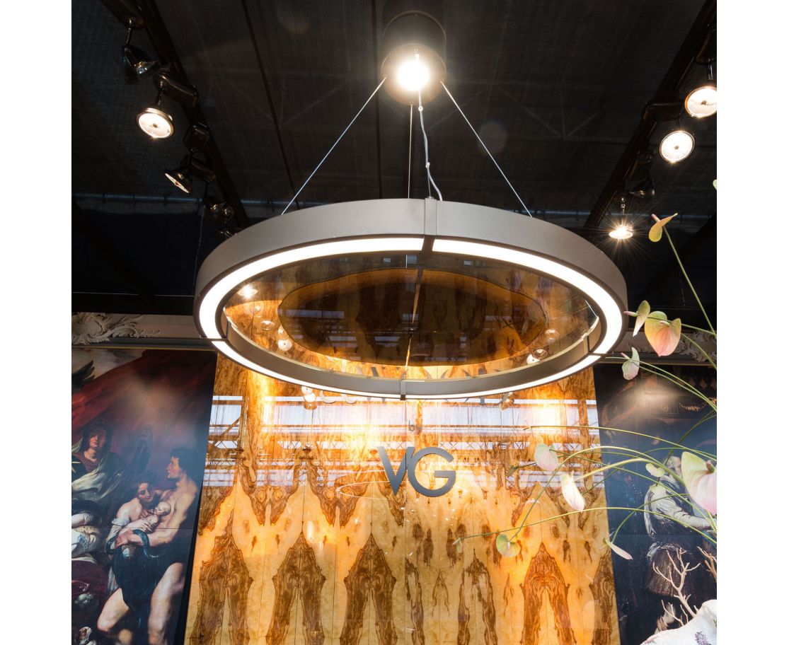 Современный подвесной светильник часть коллекции Glass & Wood. Стальная конструкция с бронзовой отделкой и светодиодной подсветкой, с двумя стеклянными слоями 5 + 5 см, содержащими тонкий срез деревянного элемента, доступный из различных древесных эссенций.