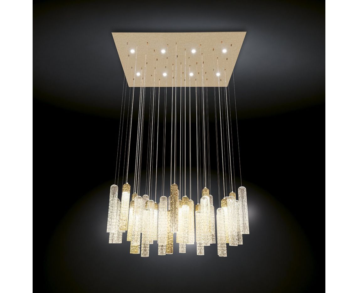Подвесной светильник из труб из муранского стекла прозрачного и золото 24k. Прямоугольная крепежная пластина, окрашенная золотом, светодиодная подсветка через прожекторы, утопленные в пластине (светодиод 60° GU10 - 7 Вт), так и через трубы, оснащенные лампами (светодиод 36° GU10 - 7 Вт).