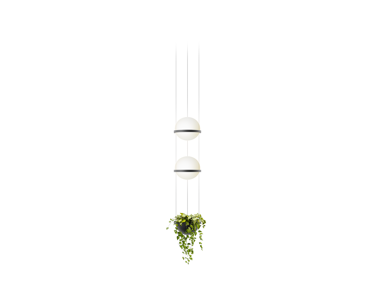 Vibia представляет подвесной светильник. Он включает в себя сферу из выдуваемого вручную стекла двух размеров, соединенную между собой ремешком и алюминиевыми конструкциями. Интенсивность светодиодного источника света регулируется с регулируемой яркостью.