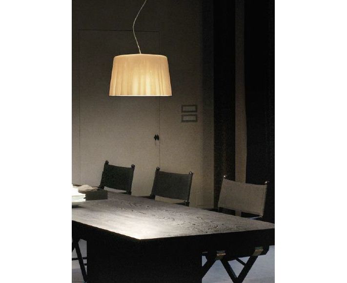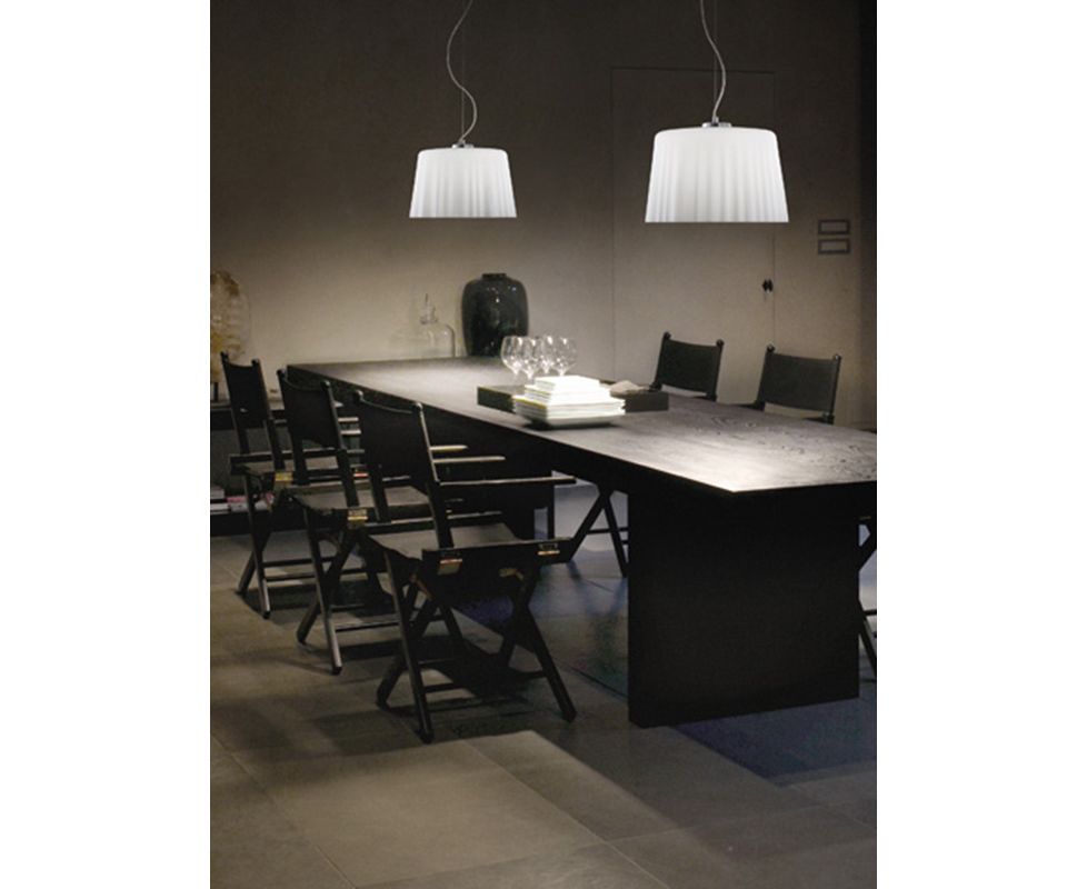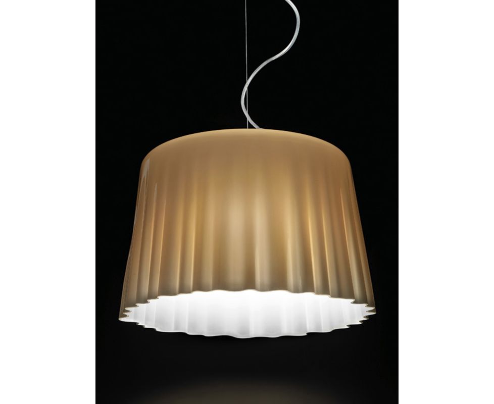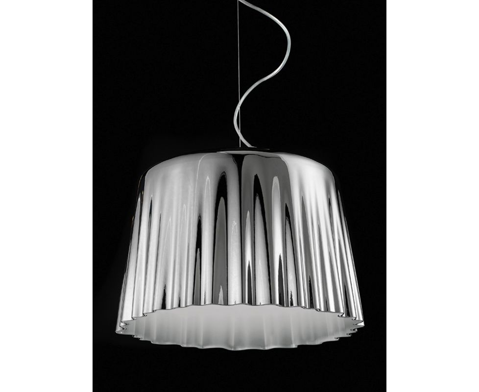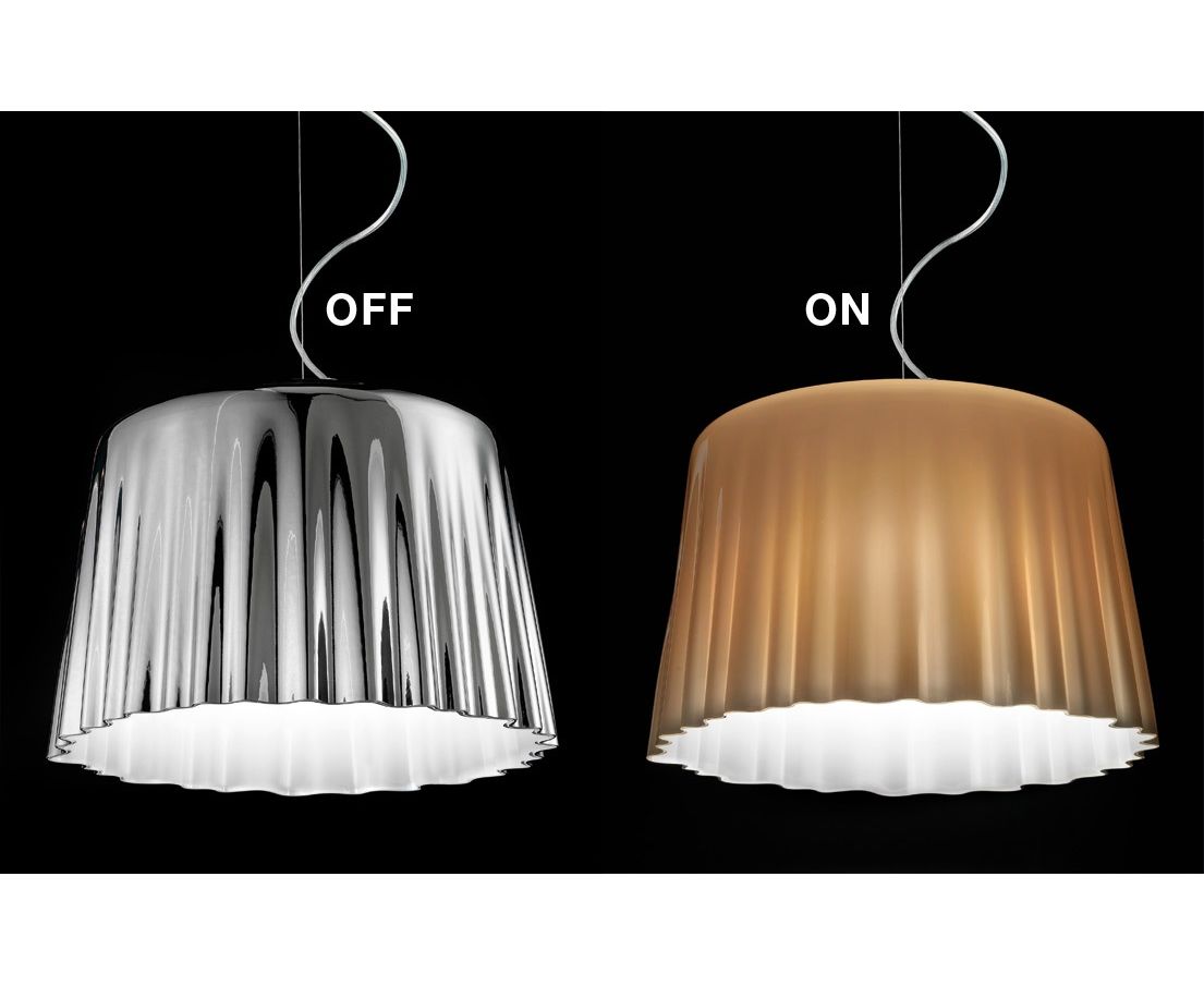 Уникальное выдувное стекло, которое, кажется, превращается в плиссированную ткань, что делает эту коллекцию настоящей притягивающей взгляд. Хромированная версия имеет эксклюзивное внешнее хромированное покрытие, которое выглядит металлическим, когда лампа выключена, но становится темно-бежевым, когда лампа включена.