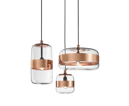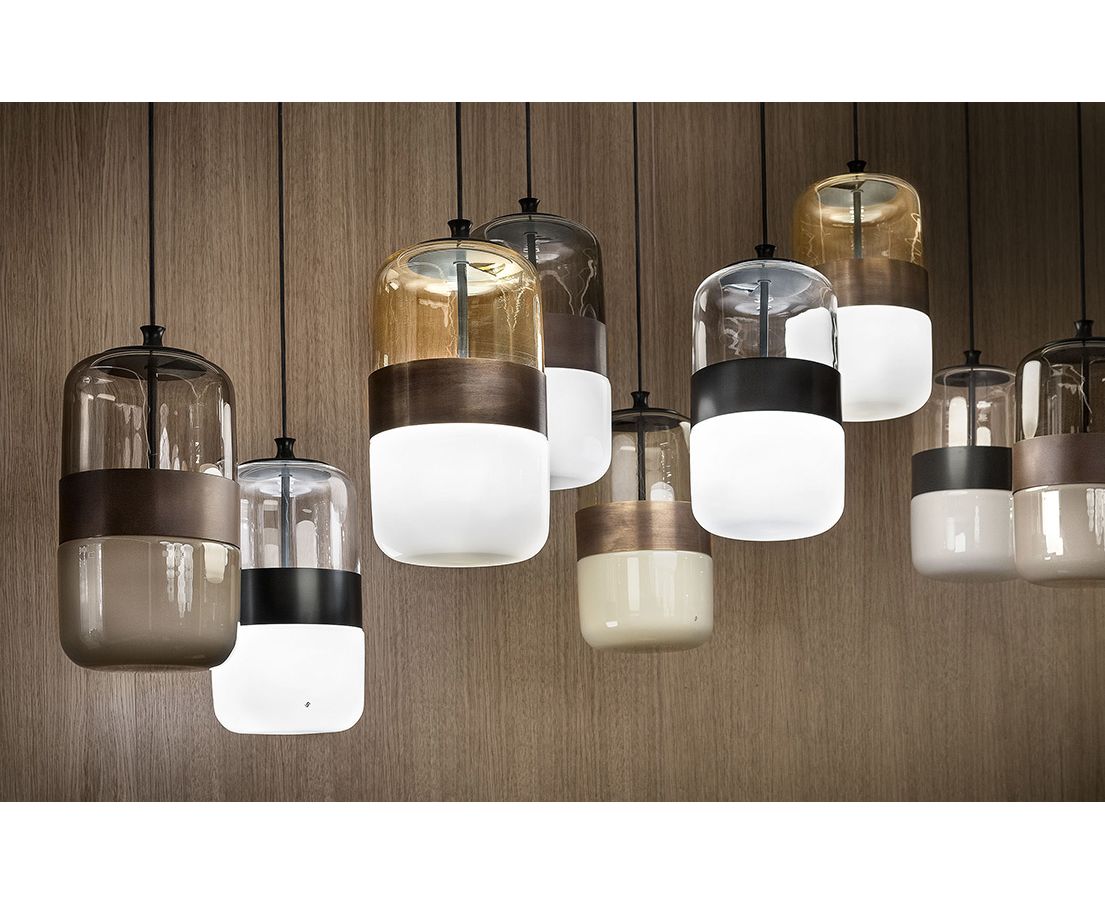 Коллекция подвесных светильников из выдувного стекла представлена в трех эксклюзивных цветах в сочетании с различными вариантами отделки металлическим кольцом. Стекло выдувается из одного целого, но особый процесс ручной работы делает цвет прозрачным в верхней части и рассеивателем в нижней части.