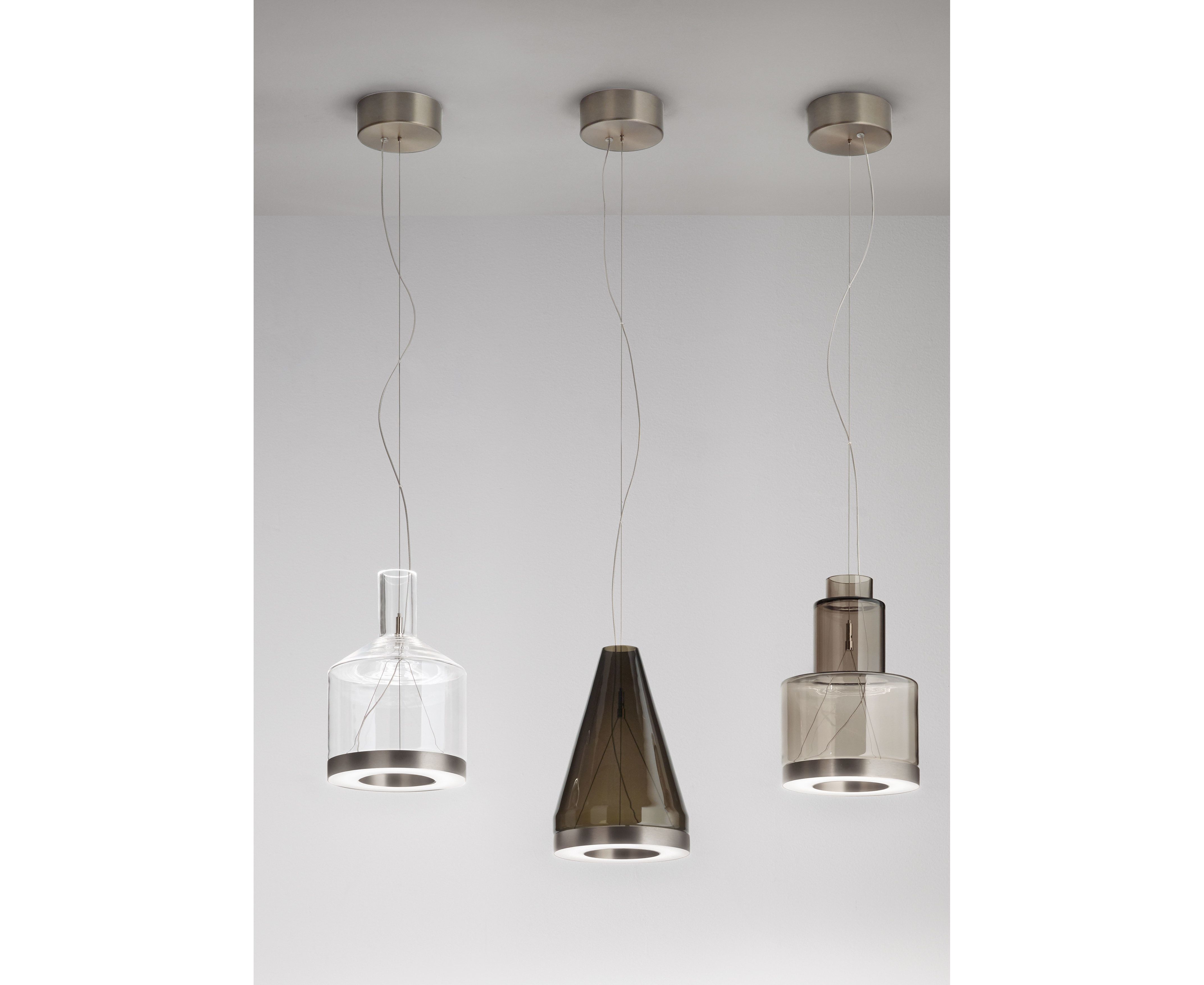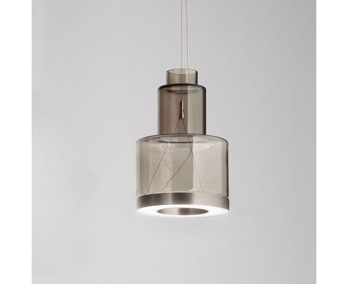 Поиск исконных форм и их комбинаций оставляют широкие возможности для интерпретации. Стекло и светлая гамма цветов создают переходные полутона, подчеркивая их форму, как в акварели ярких прозрачных пленок. Светодиодный источник освещает поверхность и стекло одновременно, принося к потолку часть мягкого цветного света. Собранные в кластеры или по отдельности, они демонстрируют сильный стилистический характер и становятся почти скульптурами.