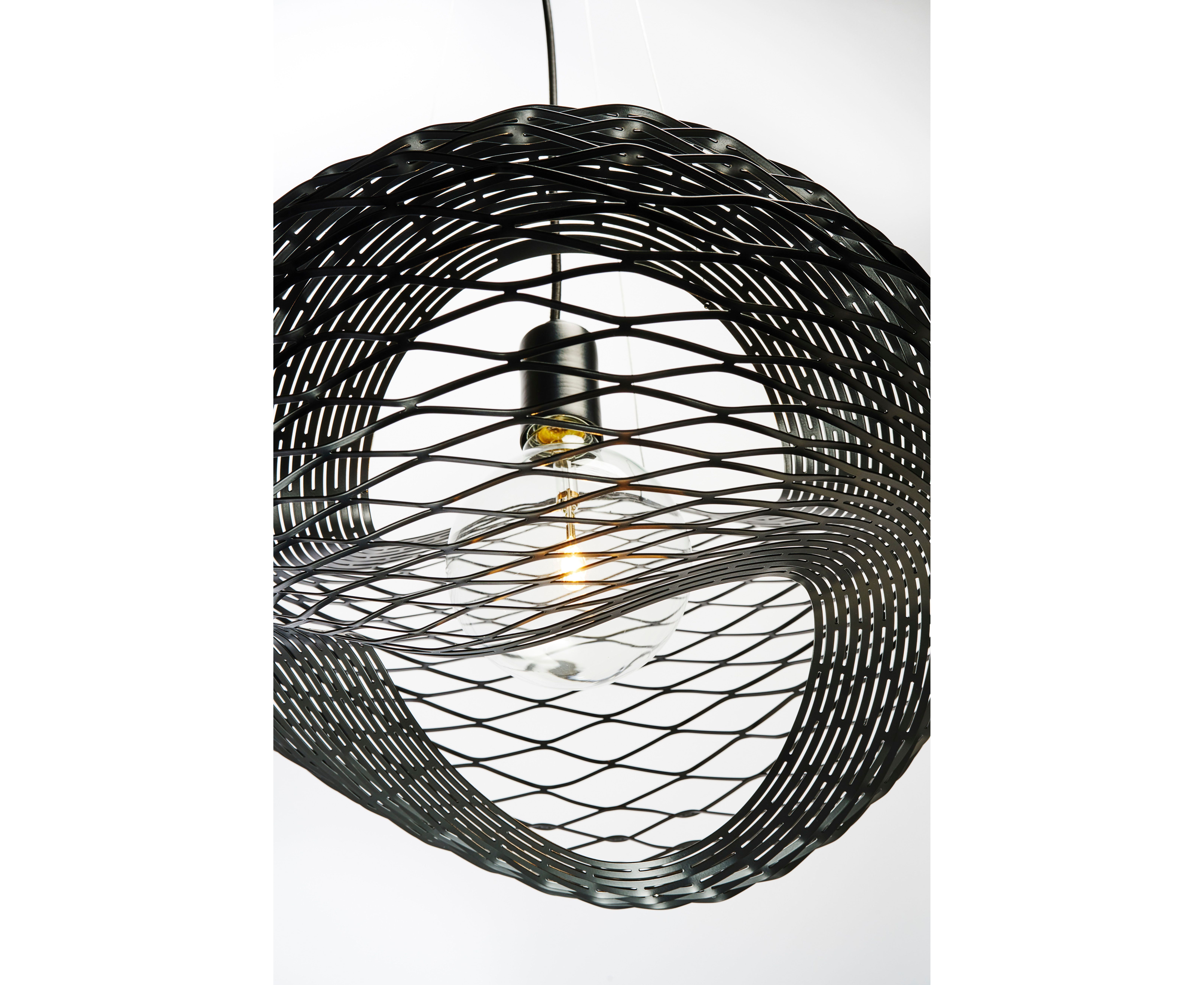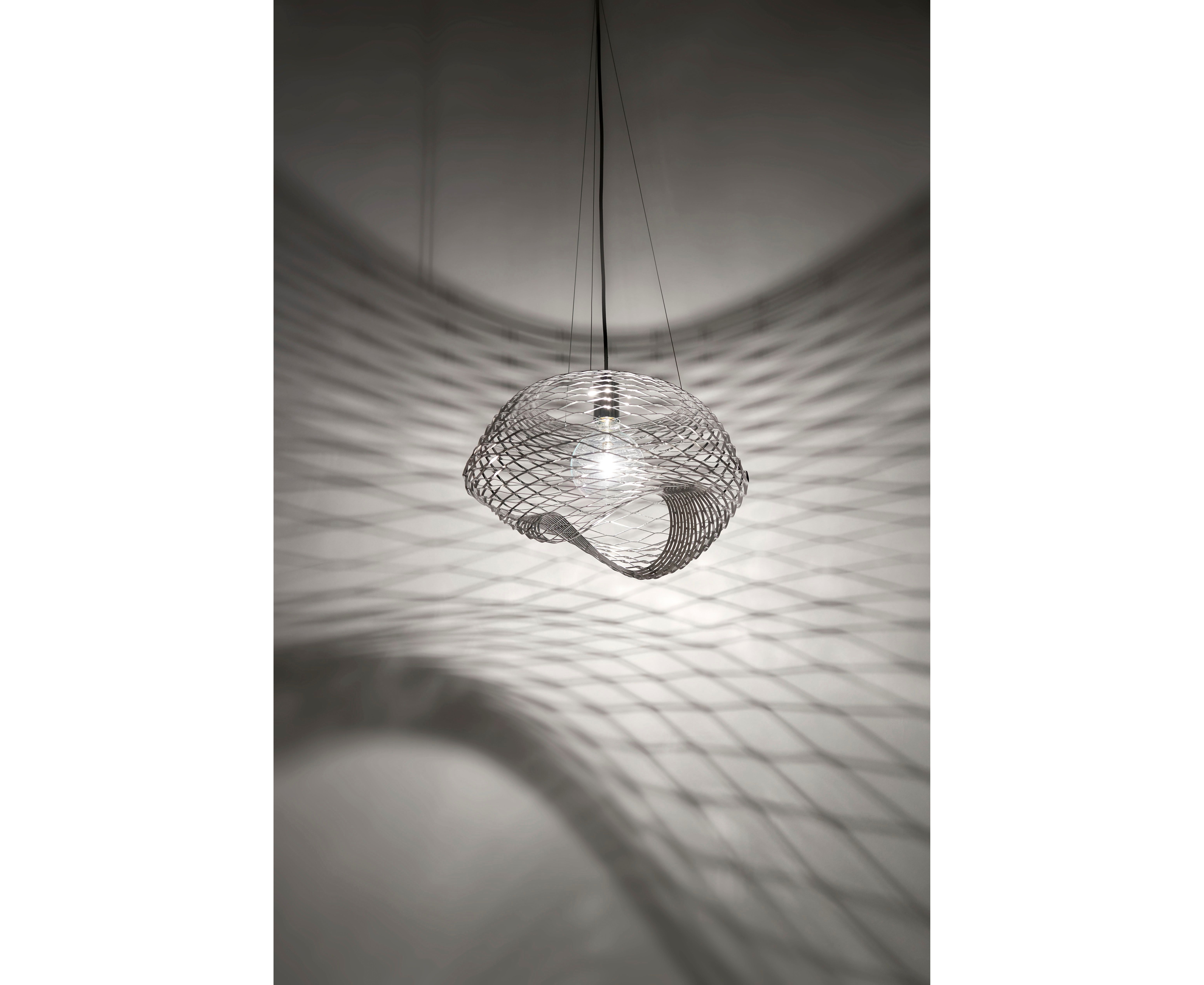 NET - это лампа из листовой стали с сильным скульптурным наклоном. Диффузор выполнен из лазерной резки на стальном листе на основе концентрических альтернативных линий. Они превращают его в толстую решетку, что позволяет диффузору достичь бесконечных стильных решений. Он может принимать простые, чистые формы для адаптации к дискретным и минимальным или сложным геометрическим и скульптурным средам, придающим характер и обогащение домов или общественных пространств. Когда он включен, он демонстрирует приятный декоративный эффект на стенах. Есть подвесные, напольные и настольные версии.