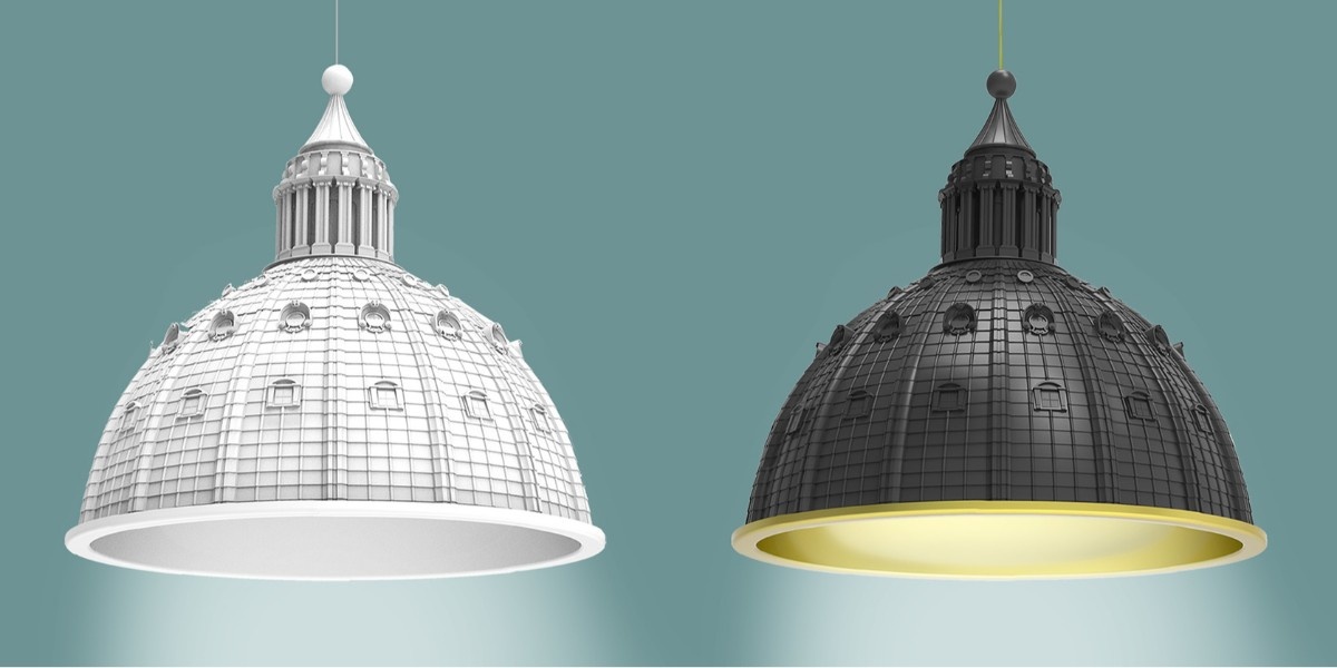 В разделе освещения также находится новый проект студии AMeBE Cupolone. Cupolone - это подвесная лампа, сочетающая в себе мастерство и технологию, гиперреалистичное воспроизведение купола Святого Петра, выполненное из смолы и представленное в двух цветах.