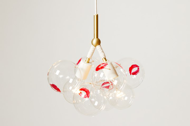 Kiss Kiss - это маленькая пузырьковая люстра с глянцевыми красными помадами на стеклянных шарах. Пятна от губной помады напоминают принты на коктейльных салфетках Мэрилин Монро.