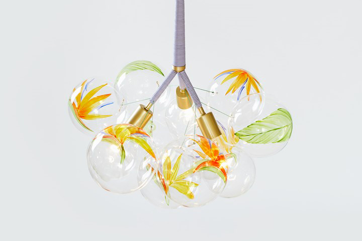 Paradise - это большая пузырьковая люстра, на каждой стеклянной планке которой изображены ручные росписи птичьих цветов и мотивы листьев. Райская птица является символом радости и представляет великолепие - цветы и листья окрашены в яркий эффект витража.