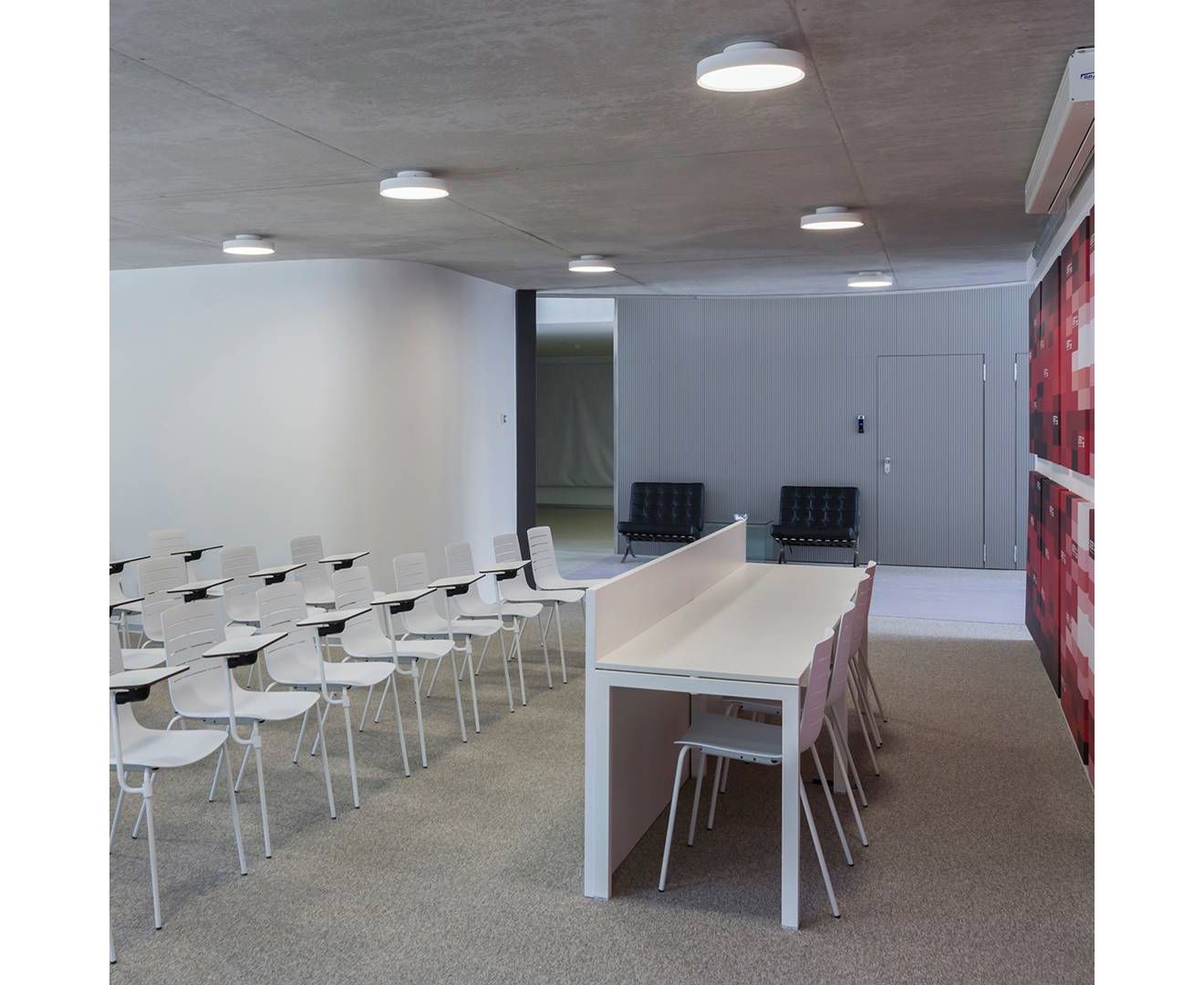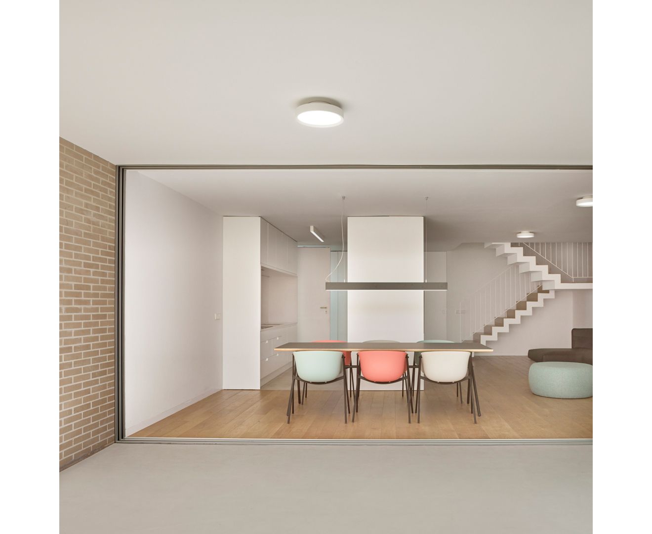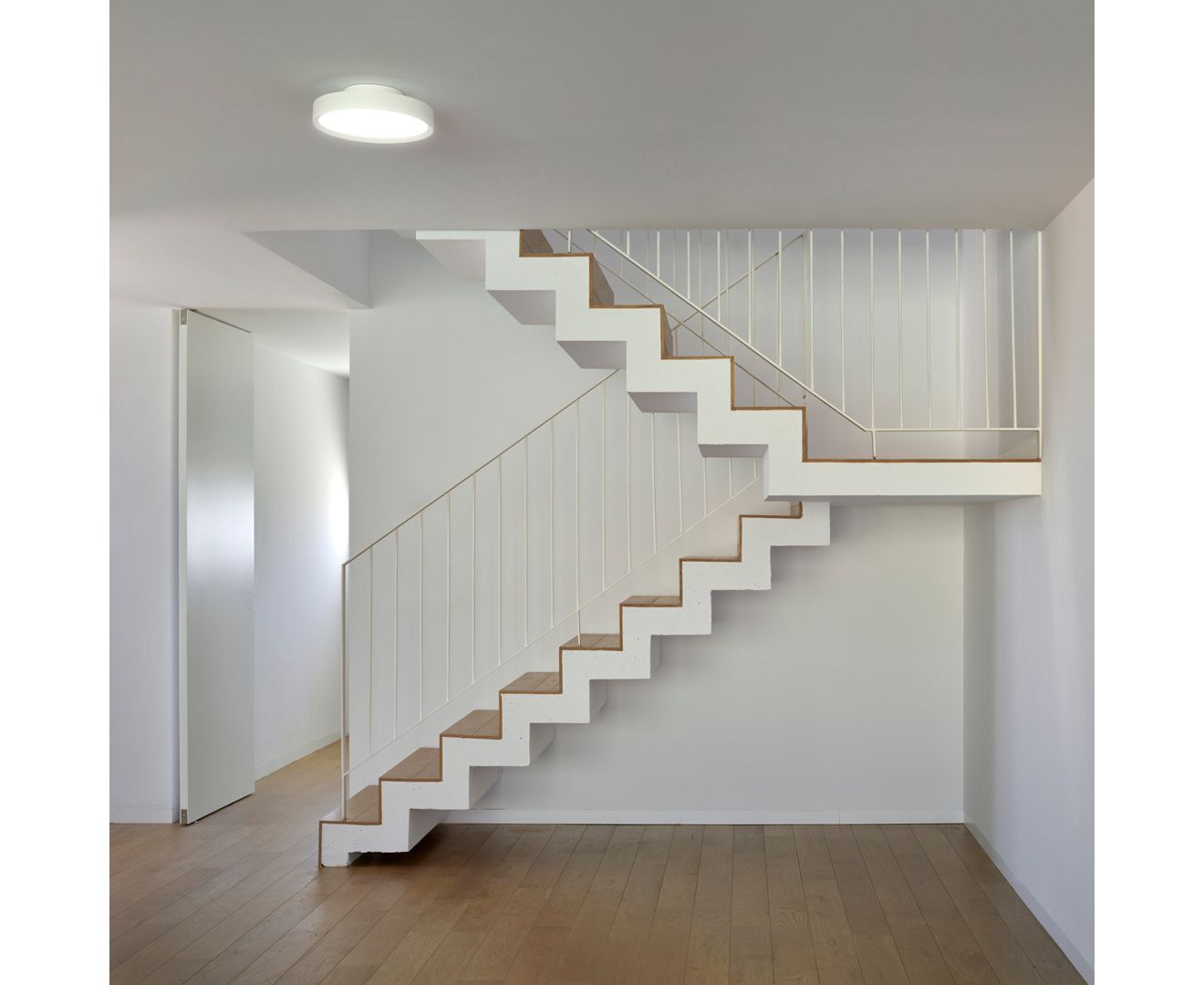 Установленный на поверхности, его дизайн создает впечатление, что Sky парит в нескольких сантиметрах от потолка, и таким образом создает особый и уникальный эффект. Способный обеспечить большой световой поток, Sky может быть установлен в проектах с очень высокими потолками, но также выделяется своей элегантной эстетикой и отделкой в небольших помещениях.