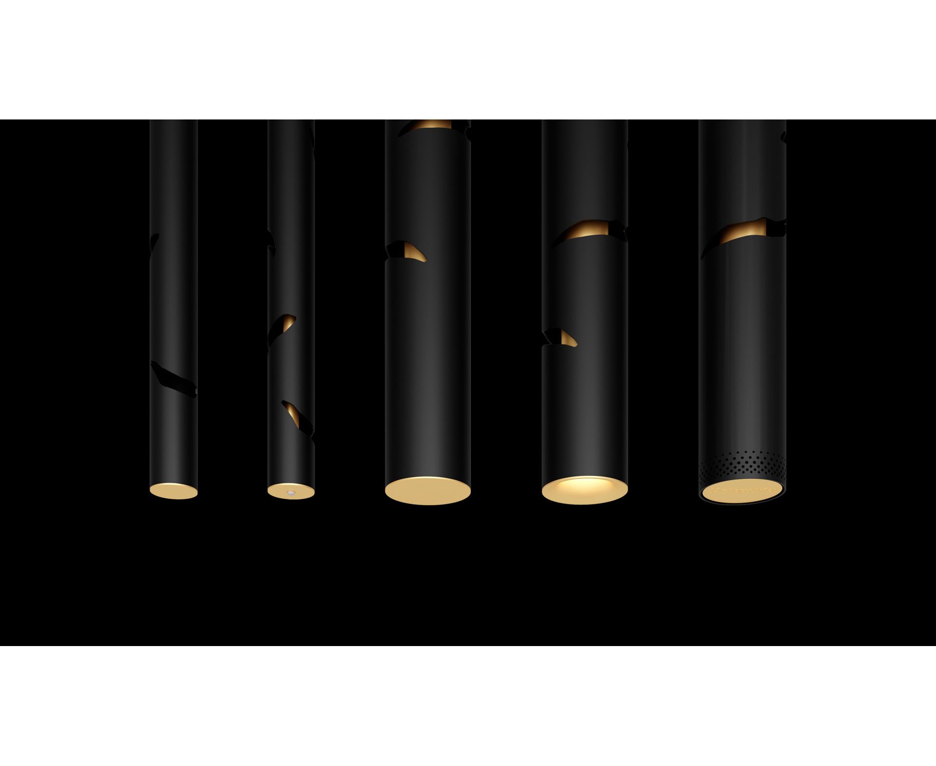 Цилиндрические тела могут иметь два размера, они могут иметь единственную функцию поддержки линии света или стать основой для прожекторов, интеллектуальных устройств и устройств, таких как динамики и датчики. Каждая емкость выдолблена несколькими извилистыми отверстиями, которые своим органическим движением напоминают пути, созданные водой. Они являются функциональными элементами блокировки светящейся линии, механического интеллекта, который становится эстетической особенностью. Множество разрезов позволяет определять различные положения для придания формы световому элементу.