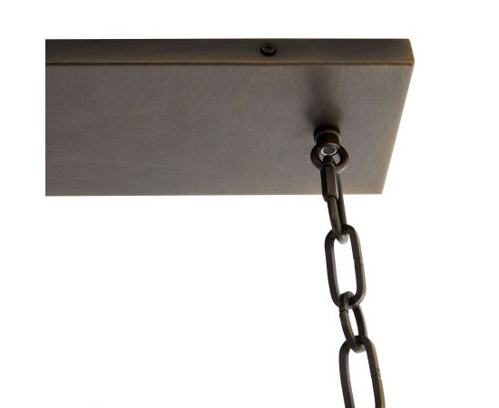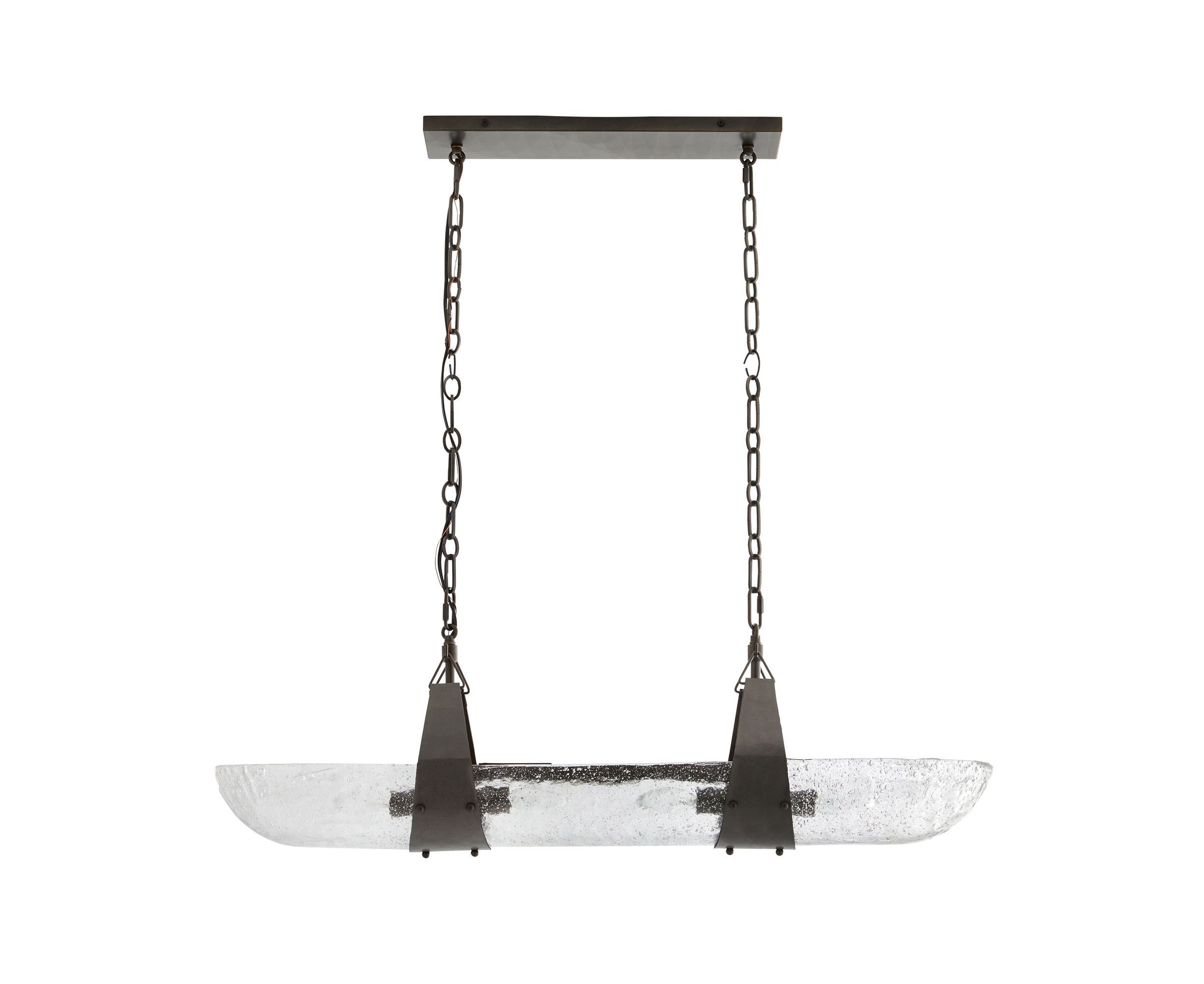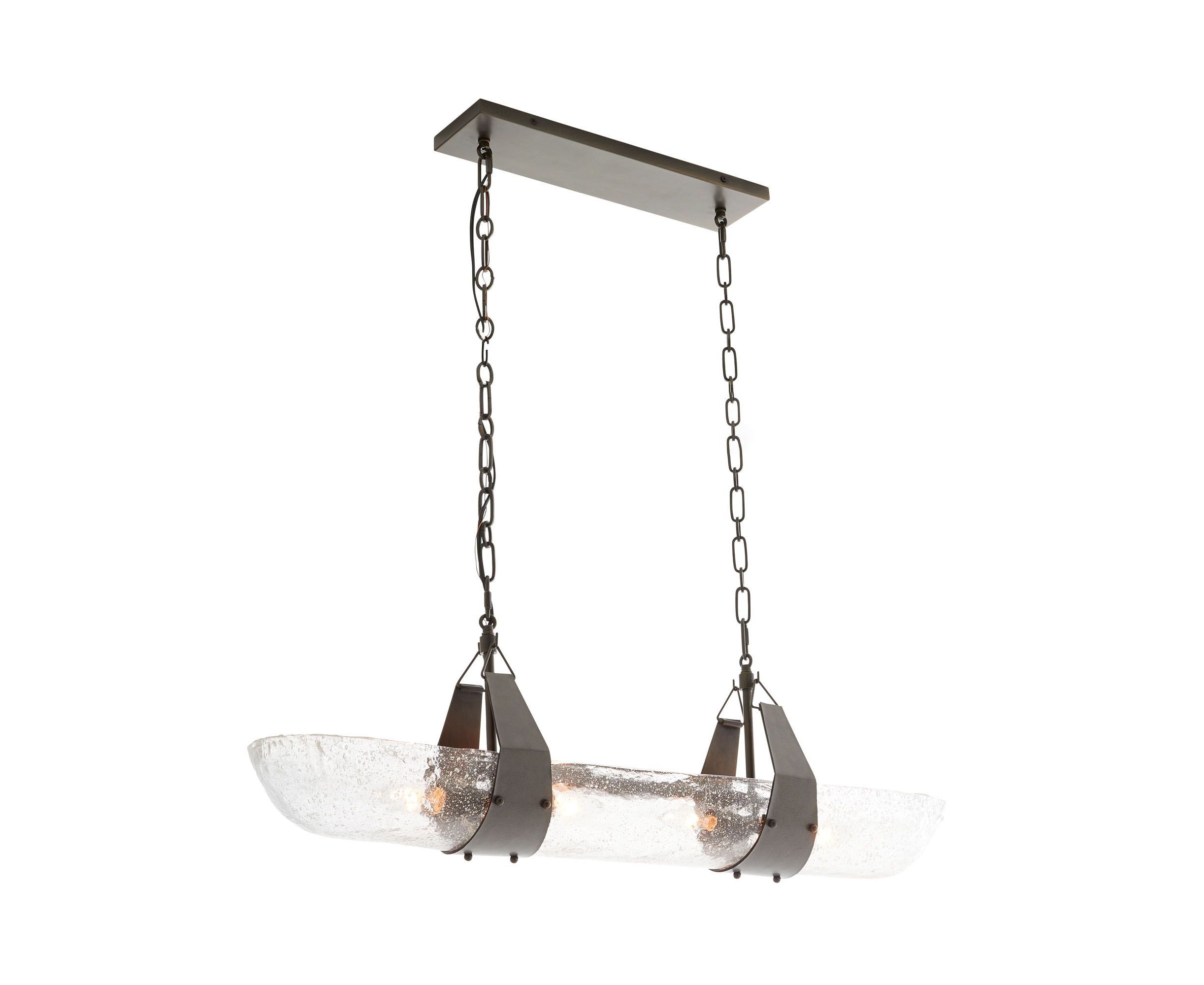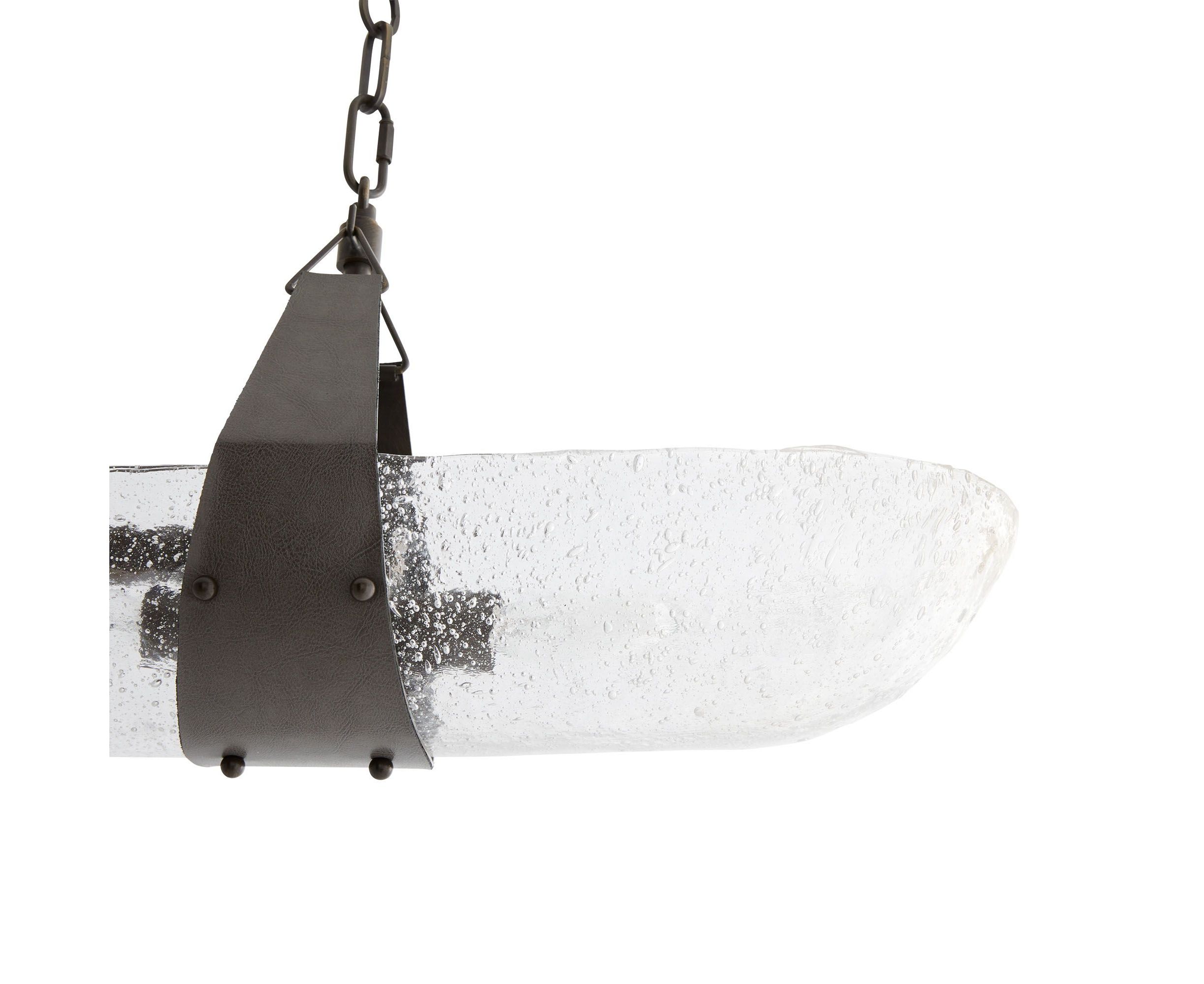 В форме лодки MYKONOS находит баланс в деревенских и изысканных элементах. Удлиненный вогнутый абажур изготовлен из прозрачного стекла и удерживается графитовыми кожаными ремнями, подвешенными к английским бронзовым железным цепям. Четыре лампы аккуратно спрятаны за стеклом и обеспечивают достаточное освещение.