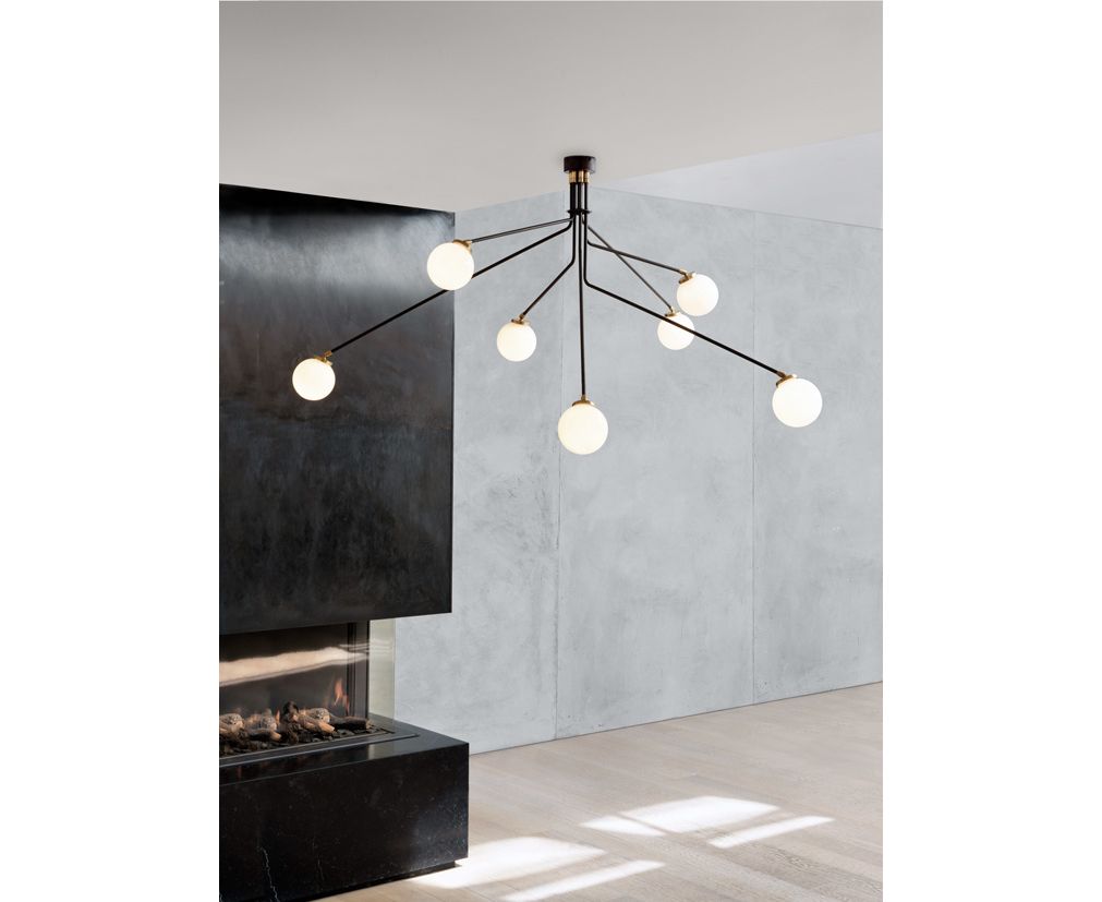 Вдохновленный Италией 60-х годов. Знакомый, но современный, его отличительная форма с вращающимися руками и выдуными рассеивателями позволяет перемещать скульптурную часть. Металлоконструкции латунные, затем бронзовые и вручную вощеные, что контрастирует с латунной отделкой.