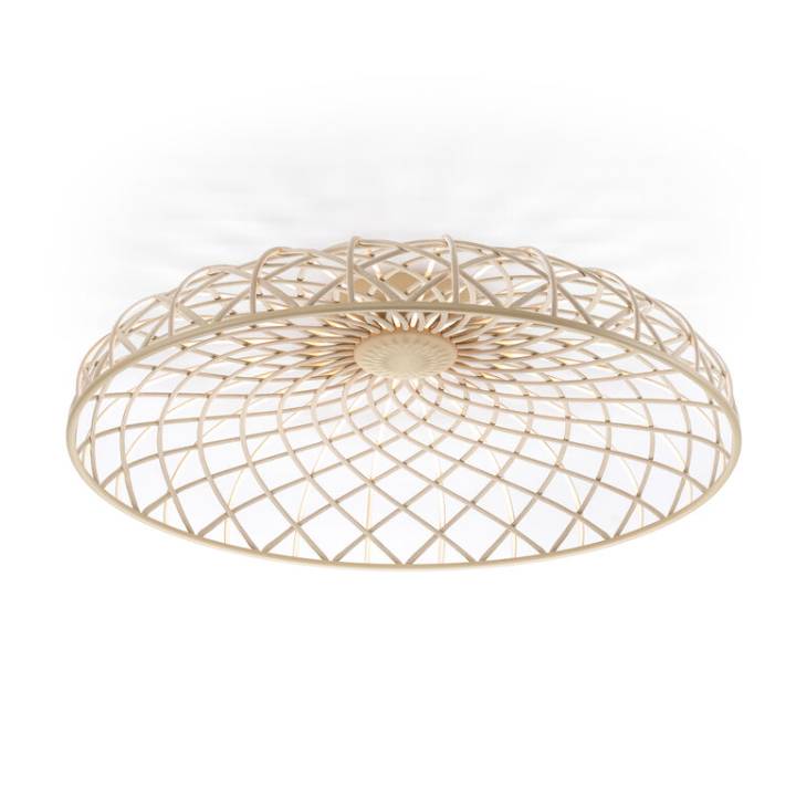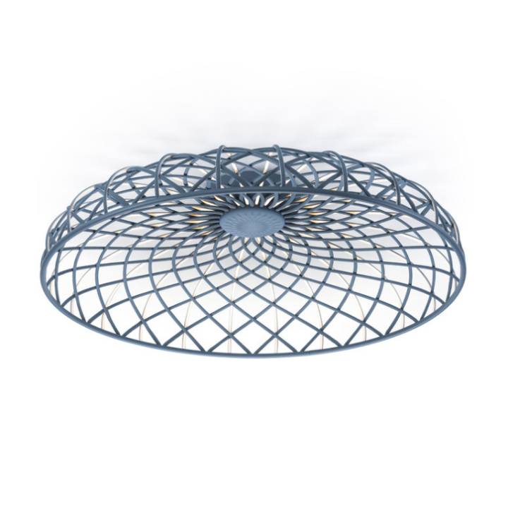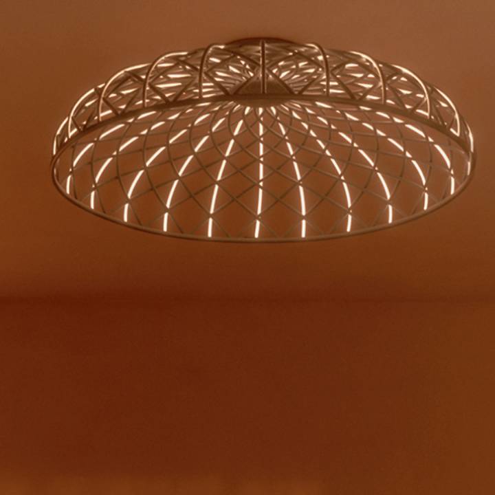 Потолочный светильник Skynest для рассеянного освещения. Лампа представляет собой комбинацию светящихся и темных элементов, расположенных в виде сетки и сформированных из стержневых структур, покрытых тонкой переплетенной цветной трубчатой сеткой, изготовленной из переработанной ткани, изготовленной из полиэстера. Каждый отдельный световой элемент питается от специальных микроразъемов, расположенных в верхней части купола, и покрыт двухцветной сеткой, в то время как сторона, обращенная внутрь купола, всегда белая, чтобы обеспечить оптимальное излучение света светодиодным модулем. Прибор оснащен встроенной системой балансировки в верхней части купола, которая помогает регулировать его баланс, делая его идеально устойчивым. Нижняя часть купола дополнена алюминиевым кольцом, которое удерживает всю сетевую структуру купола на месте с помощью простой системы защелкивания. Изделие собирается абсолютно без использования клея, поэтому его можно полностью отделить для вторичной переработки в будущем и в случае какого-либо ремонта или замены. Доступные варианты отделки светильников: синий турмалин, миндаль, антрацит или кирпично-красный. Пластиковая конструкция, окрашенная в тот же цвет, что и лампа, оснащена встроенной электроникой, позволяющей использовать различные системы регулировки яркости.